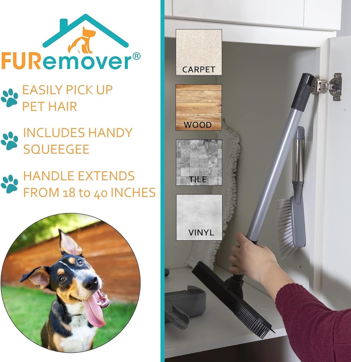 FURemover Compact Pet Hair Rubber Broom with Squeegee, with Handle That Telescopes up to 40" for Carpet, Tile and Hardwood
