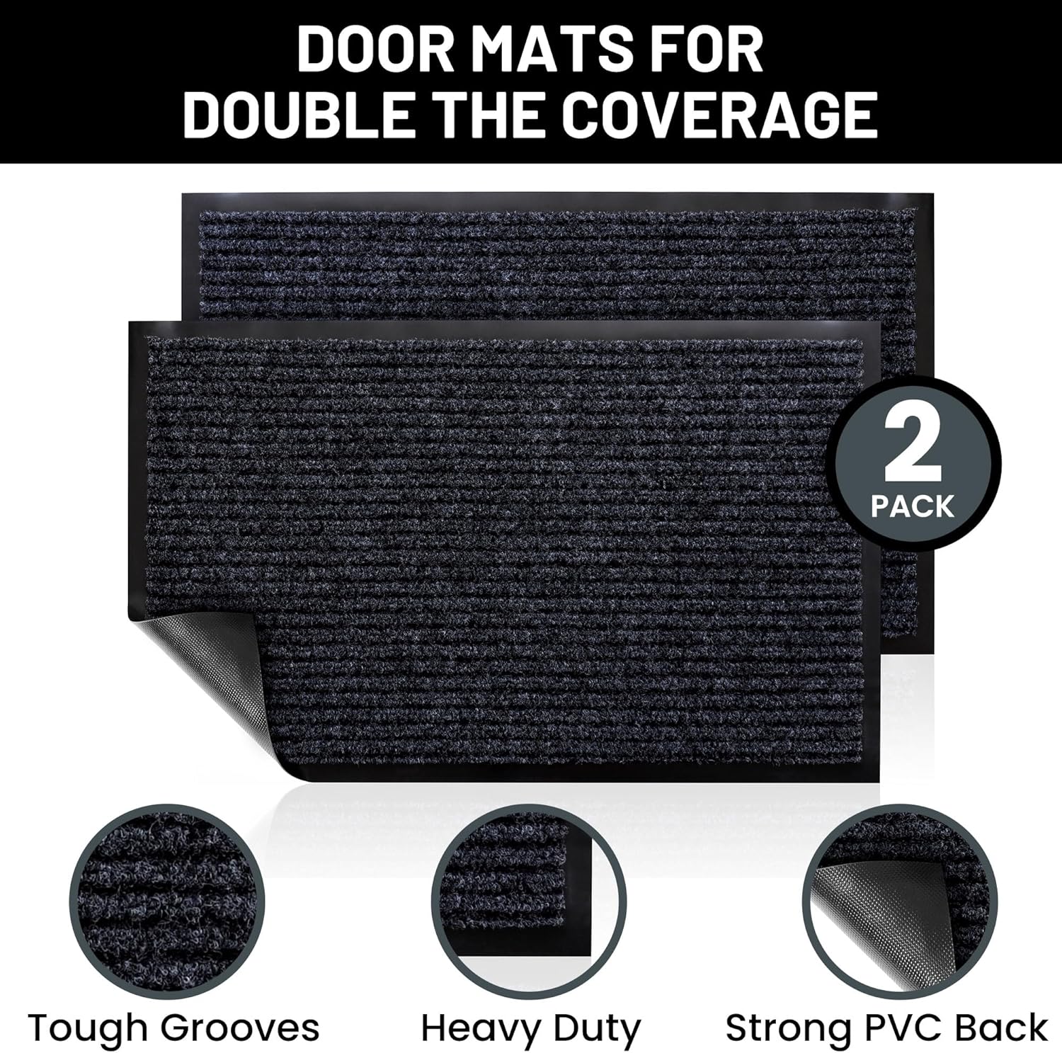 - Includes 2 Indoor Outdoor Floor Mats: Enjoy two amazing heavy duty high quality ribbed polyester door mats (30" x 17") that will be perfect welcome for the everyday home. Amazing value 2-Pack Steel Gray/Black Color.