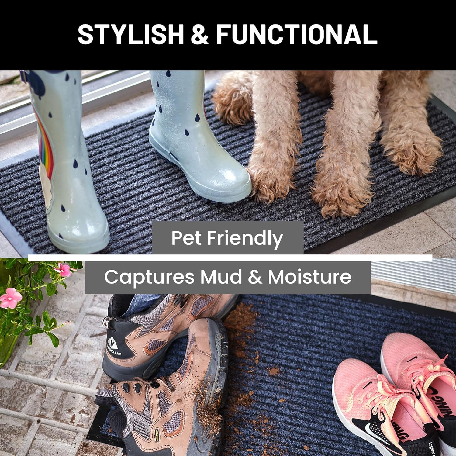 - Ideal Front Door Floor Mat Use: Indoor, outdoor, porch, kitchen, side, front door, entryway, hall, patio, garage, laundry, bathroom, dog mud, or any location that sees a good amount of foot traffic. Perfect for keeping your floors clean as the ribbed material helps scrape dirt and debris from shoes.
