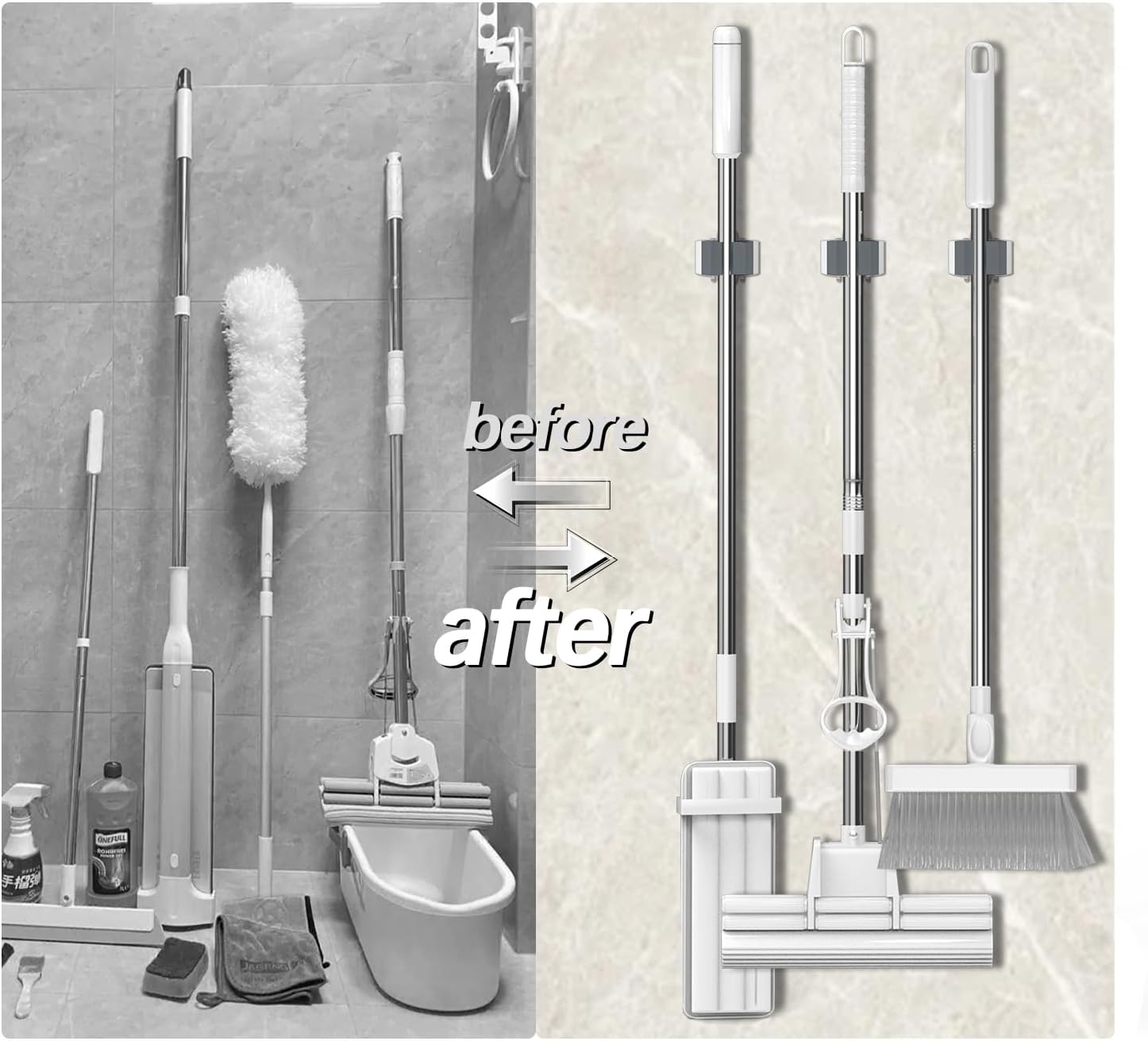 - FROM MESS TO HOME DECOR – do you have the time don’t know how to store your home cleaning tools which is taking over your kitchen,bathroom,laundry rom or garage shelving, declutter with 3-H broom holder wall mount that will keep everything looking neat and cozy