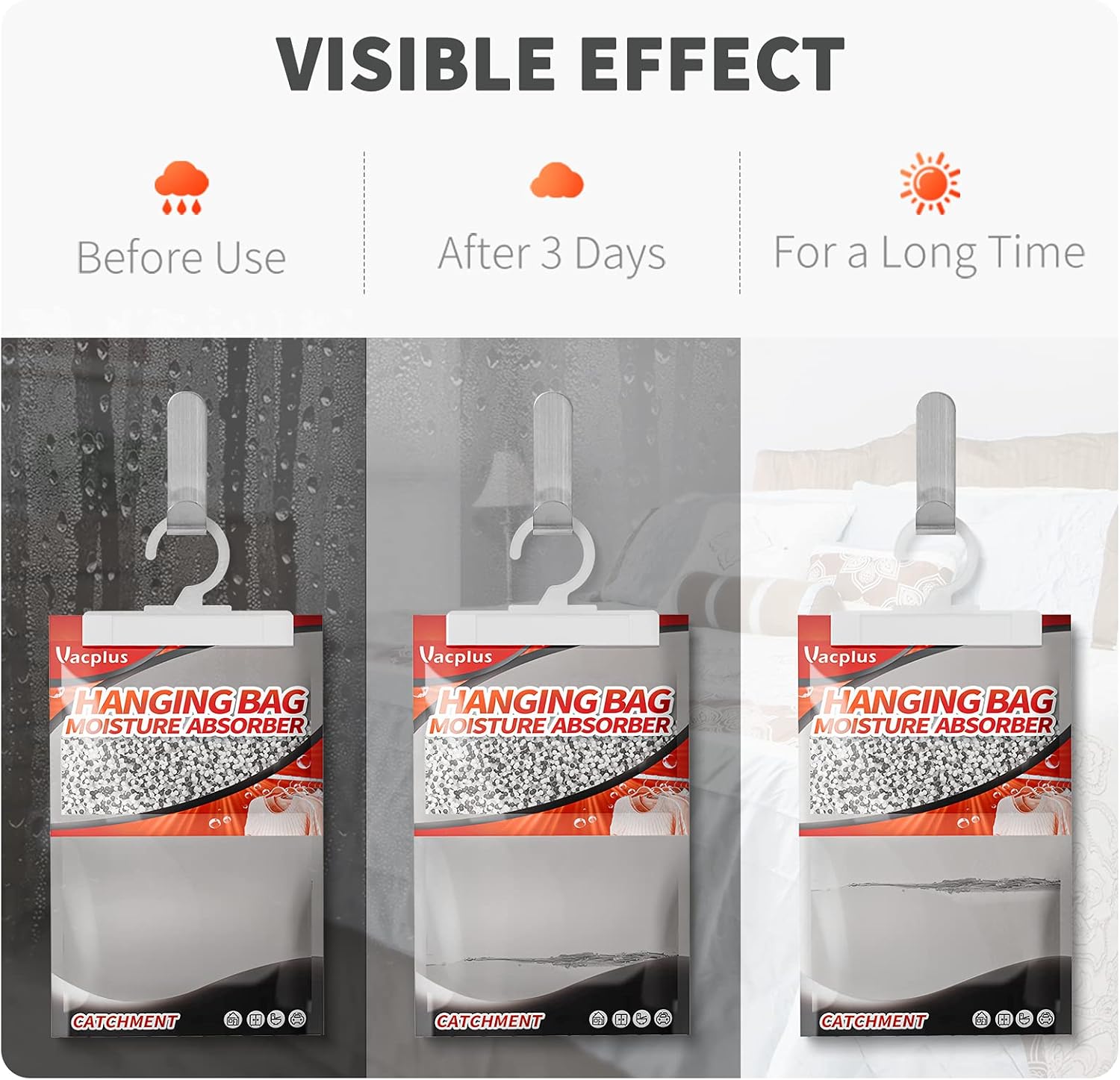 - VISIBLE EFFECT: The moisture is contained in a little plastic bag at the bottom. What amazing is that you can see the water added day by day, and really see the effectiveness. Vacplus create a dry and comfortable indoor environment.