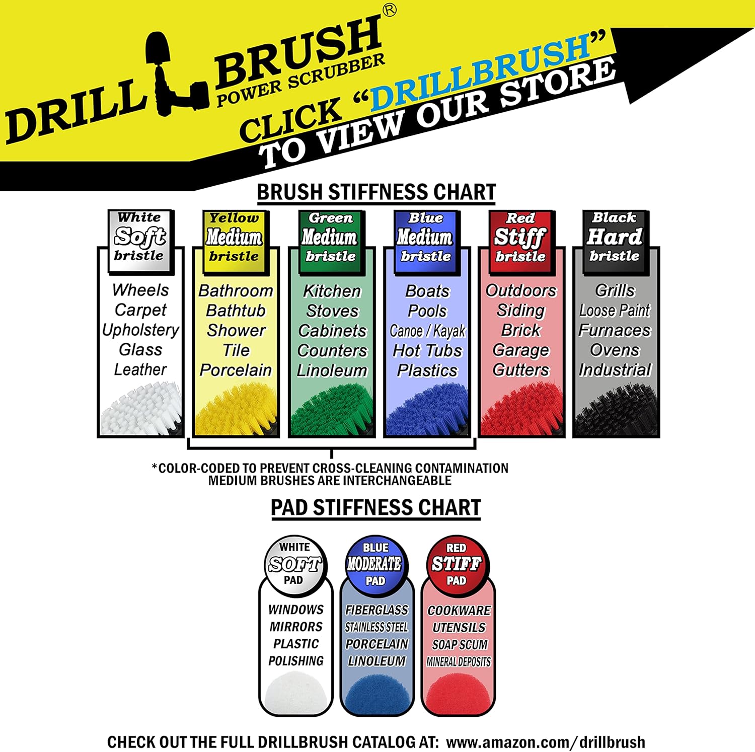 - This 21-piece detailing brush set includes 8 unique cleaning brushes for drills in our soft white stiffness to insure you have the correct size to turn your drill into a carpet cleaner machine. This kit also includes 4 different types of pads, our white soft, moderate red, stiff blue, and foam orange to insure you have the right stiffness to tackle even glass cleaning needs. Our best-selling original bullet shaped brush is great for contours and crevices.