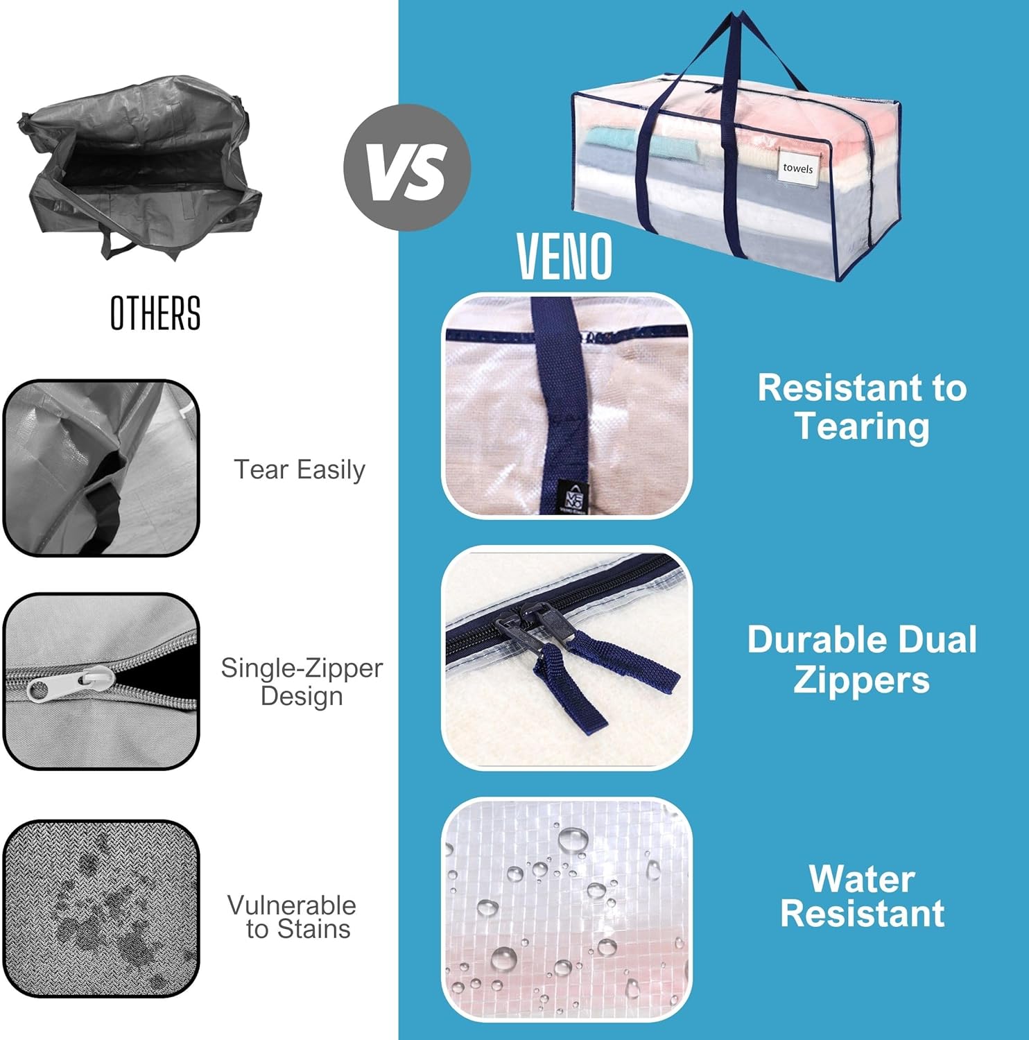 VENO 4 Pack Moving Bags Plastic Storage Totes Clothes Organization Large W Lid/Zipper. Packing Boxes/Bins Alternative. Space Saving Foldable College Supplies Essentials (Clear, 4 Pack)