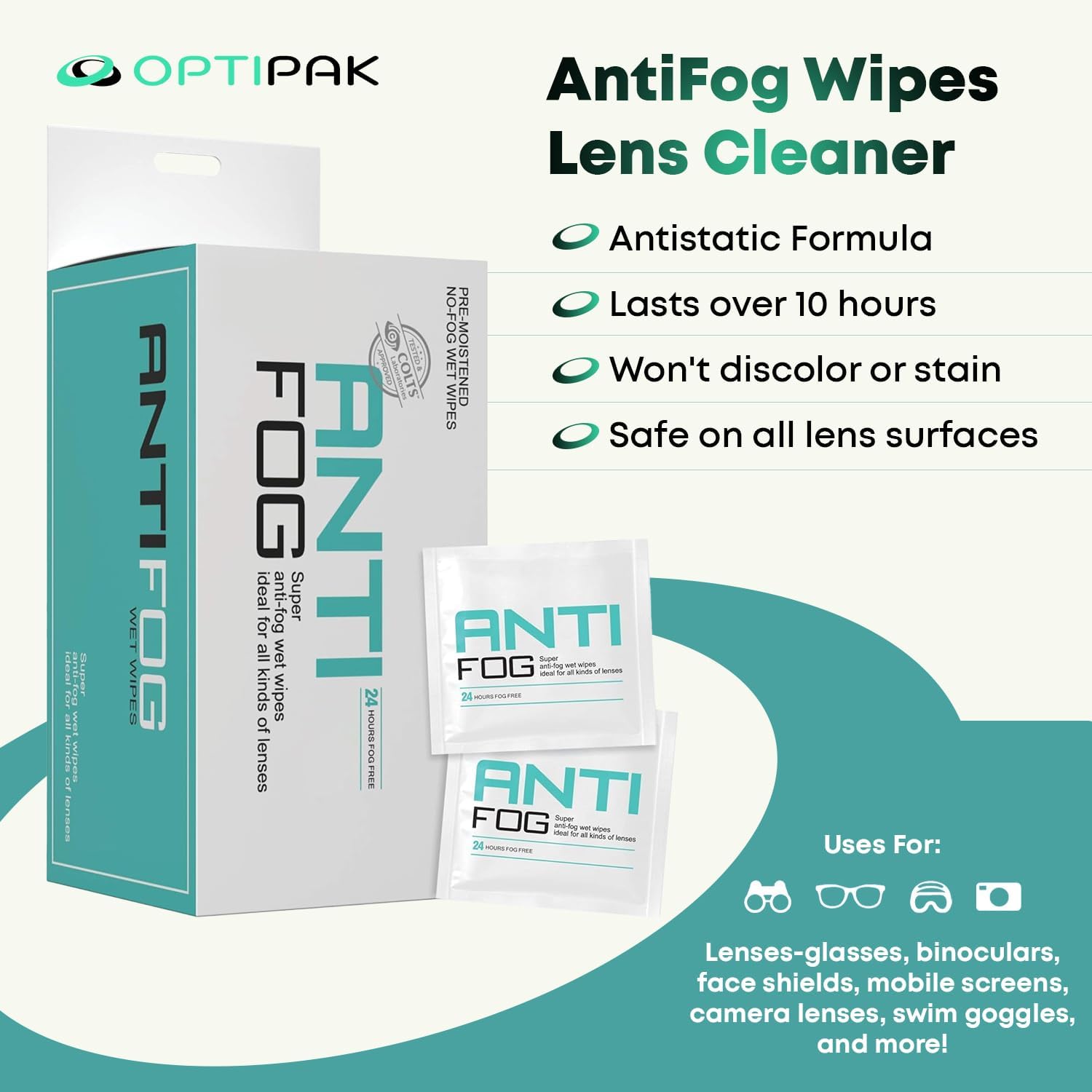 - Pre-Moistened Anti Fog Lens Cleaner Wipes: Optipak's premoistened glasses wipes clean and treat eyeglasses, sunglasses, goggles, and safety eyewear. Each individually wrapped wipe ensures clear, fog-free lenses in seconds.