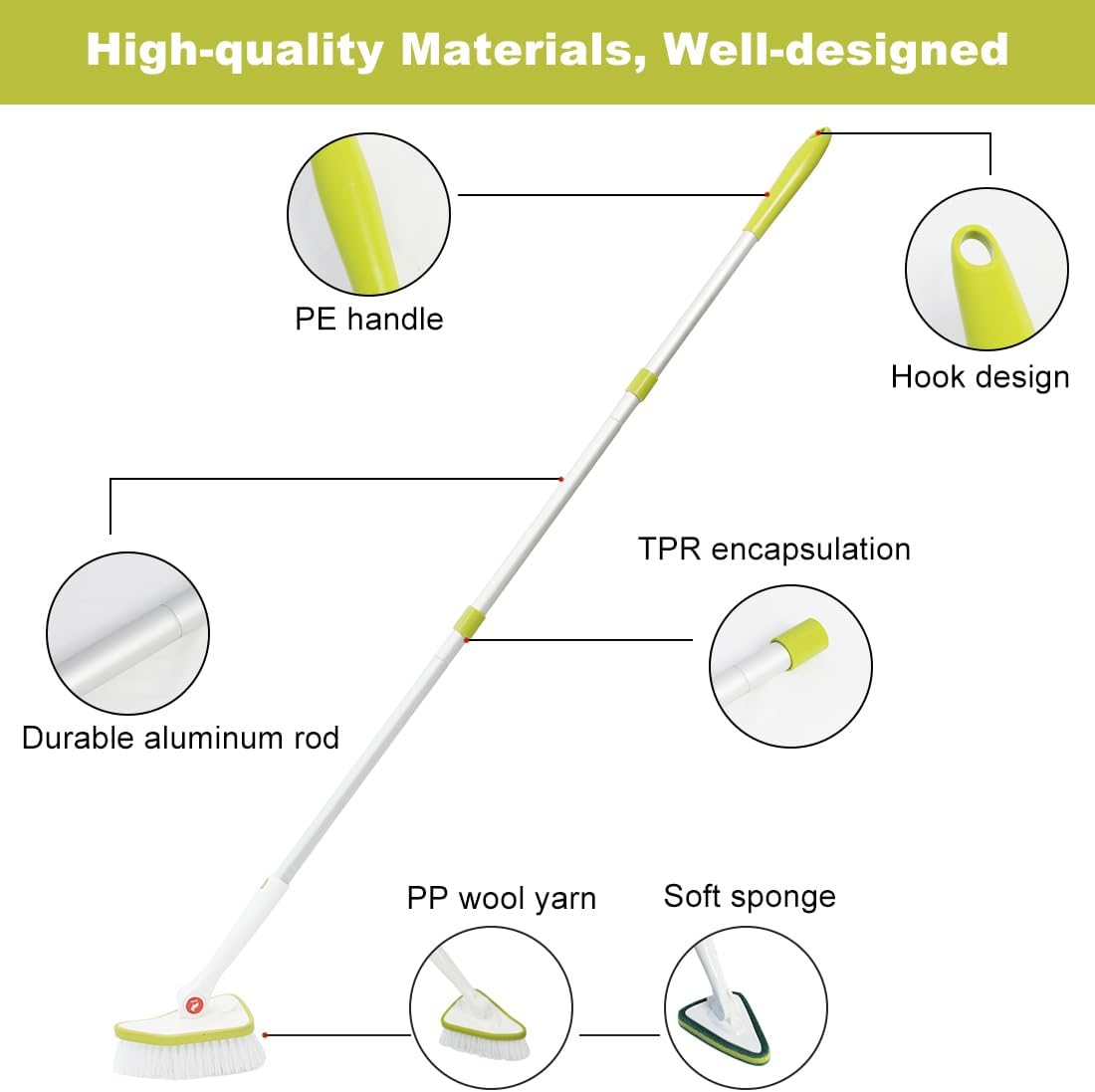 - CQT BATHROOM BRUSH WITH LONG HANDLE--You will get 3 x Pole Parts(Detachable), 1x Bristles Stiff Brush, 2 x Replaceable Brush Head and 2 x Replaceable Sponge Head.Long handled scrub brush extends from 31.5" to 48" with a quick twist without bending or climbing.