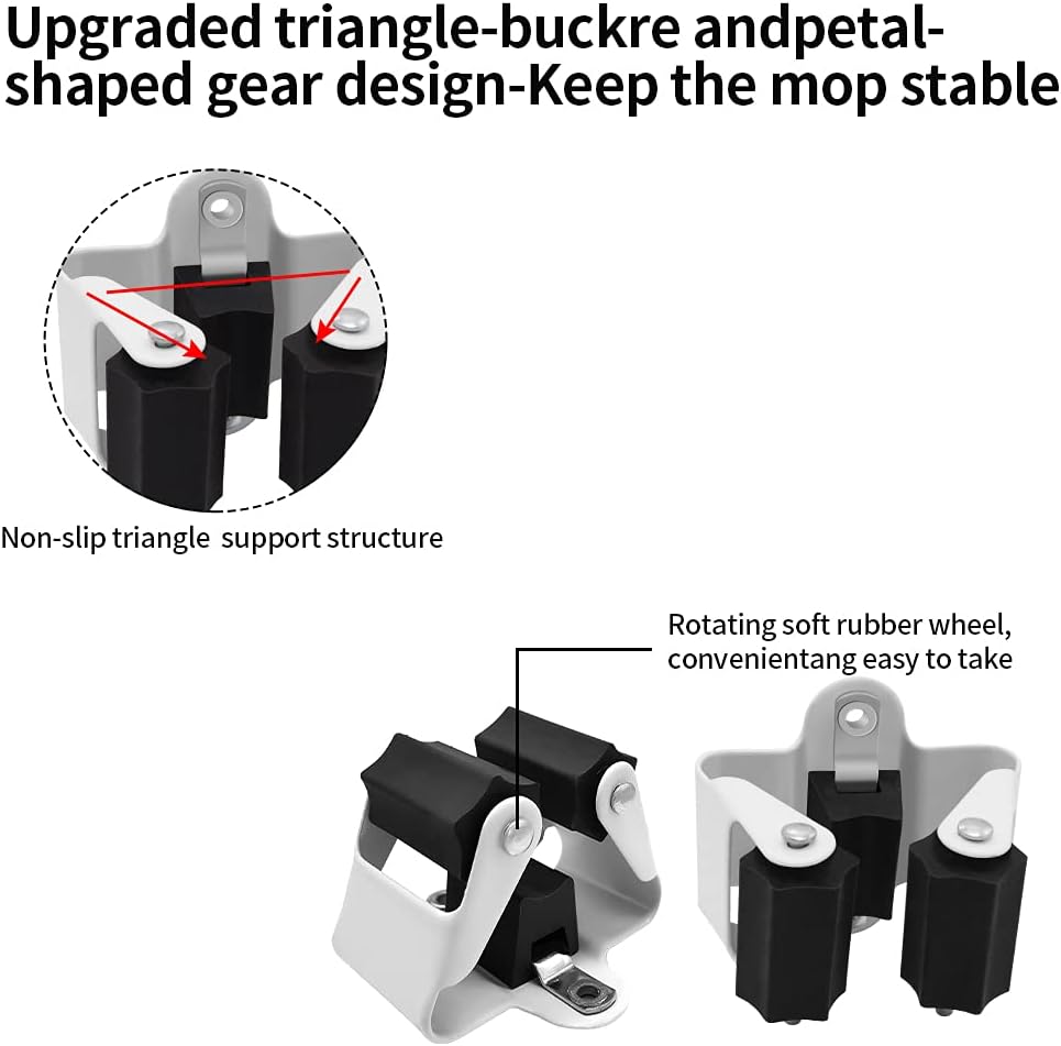 - EASY TO USE: Because mop broom holder wall mounted is made of 0.7mm thick metal material instead of 0.5mm as most of the ones on the market, you don’t have to worry about deformation even if you use it indoors or outdoors for a long time.You can slide the broom in and out with one hand. Unlike plastic mop holders with spring-loaded rollers, this broom organizer wall mount has rubber rollers to hold the handles, allowing the handle to slide in from the front and be held firmly in place.