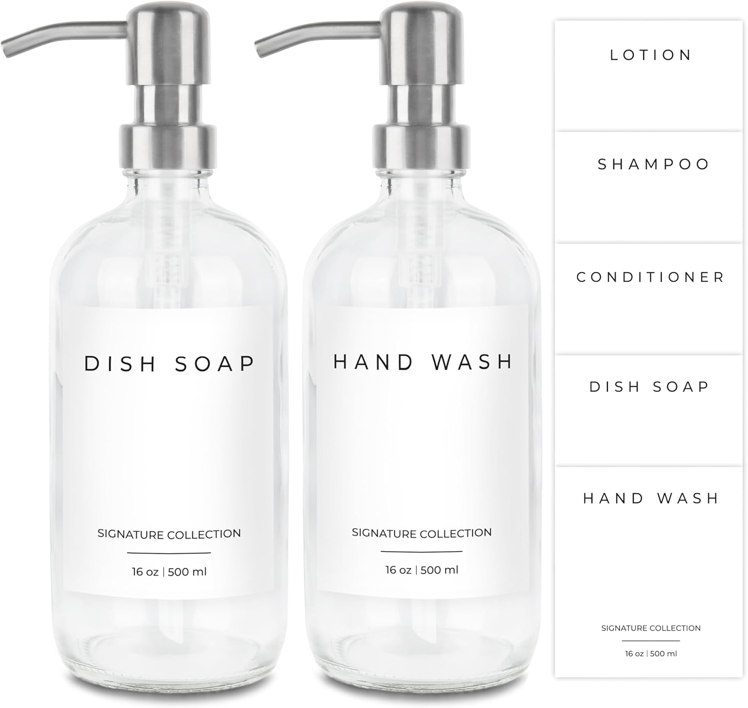 - ✅ 2-in-1 COMBO: Upgrade your home with our glass soap dispenser set. The dish soap dispensers are crafted from the highest quality glass and can be used as soap dispensers for kitchen sinks, soap dispensers for bathrooms, or as hand soap dispenser of your favorite liquid. The kitchen soap dispensers come with 2 dish soap dispensers for kitchen bottles (16 ounces), 2 stainless steel pumps, and 5 waterproof labels. Our selection includes colors including amber, clear, white, and black.