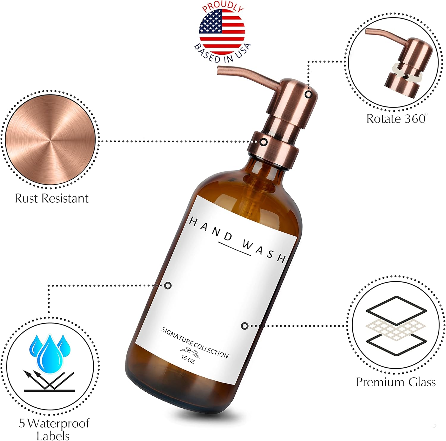 - ✅ 5 WATERPROOF LABELS: Now with 5 stickers, it's your choice to use the Kitchen Soap Dispenser Set with Dish Soap for hand soap, dish wash, lotion, conditioner, or shampoo. To clean the lotion dispenser set for the bathroom and kitchen sink soap dispenser set, just run the bottle under water and watch any residue simply wash off. With our exclusive no-leak pump, the bottle enables you to put out a good amount of soap with a single pump.