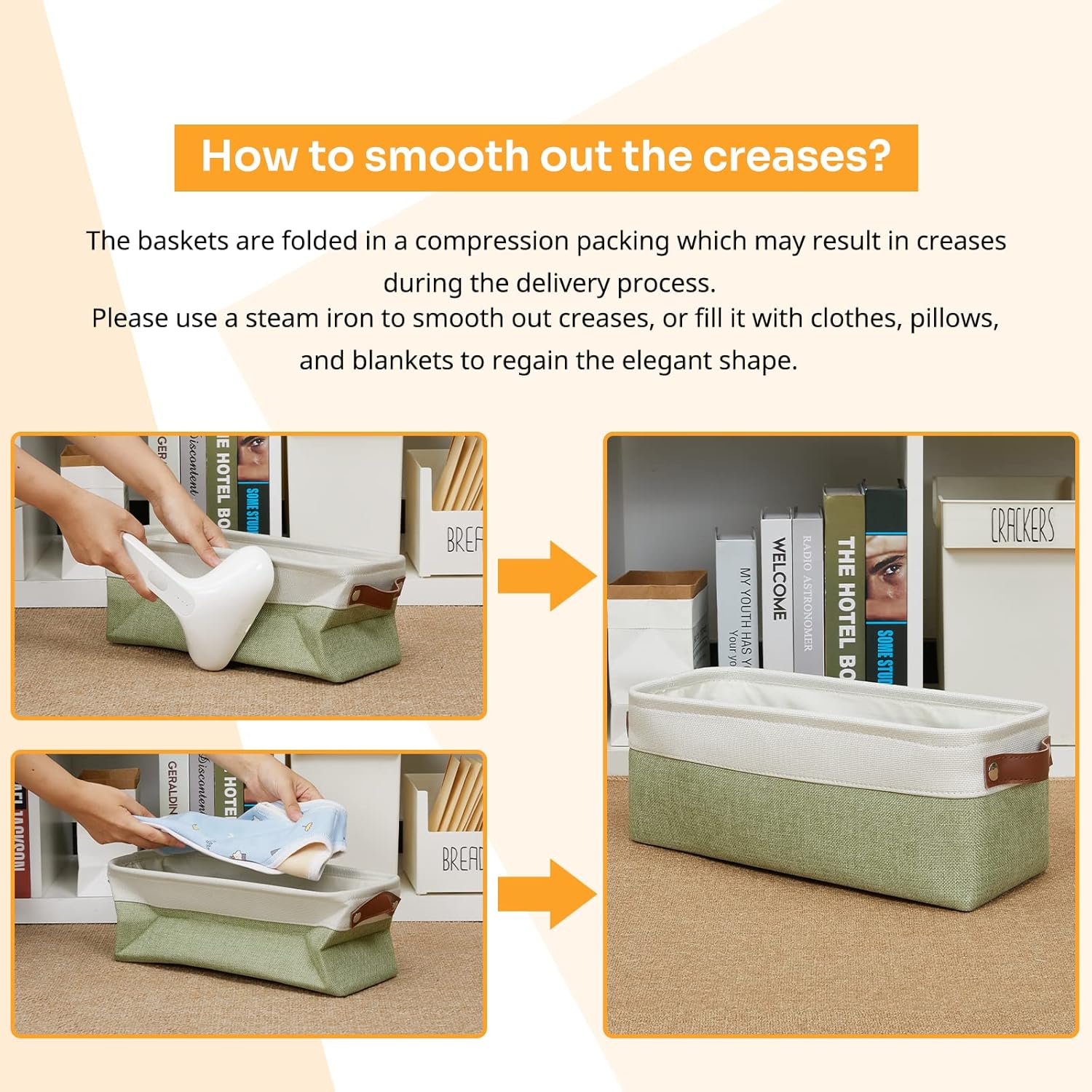 - 【EASY TO CARE】The narrow storage basket is sturdy and has no odor. Built to last these bins are reinforced with an O-ring on the top to give shape and structure so they are not machine washable. Lined with a thin linen fabric, the small storage bins are easy to clean, just wipe with a damp sponge or cloth.