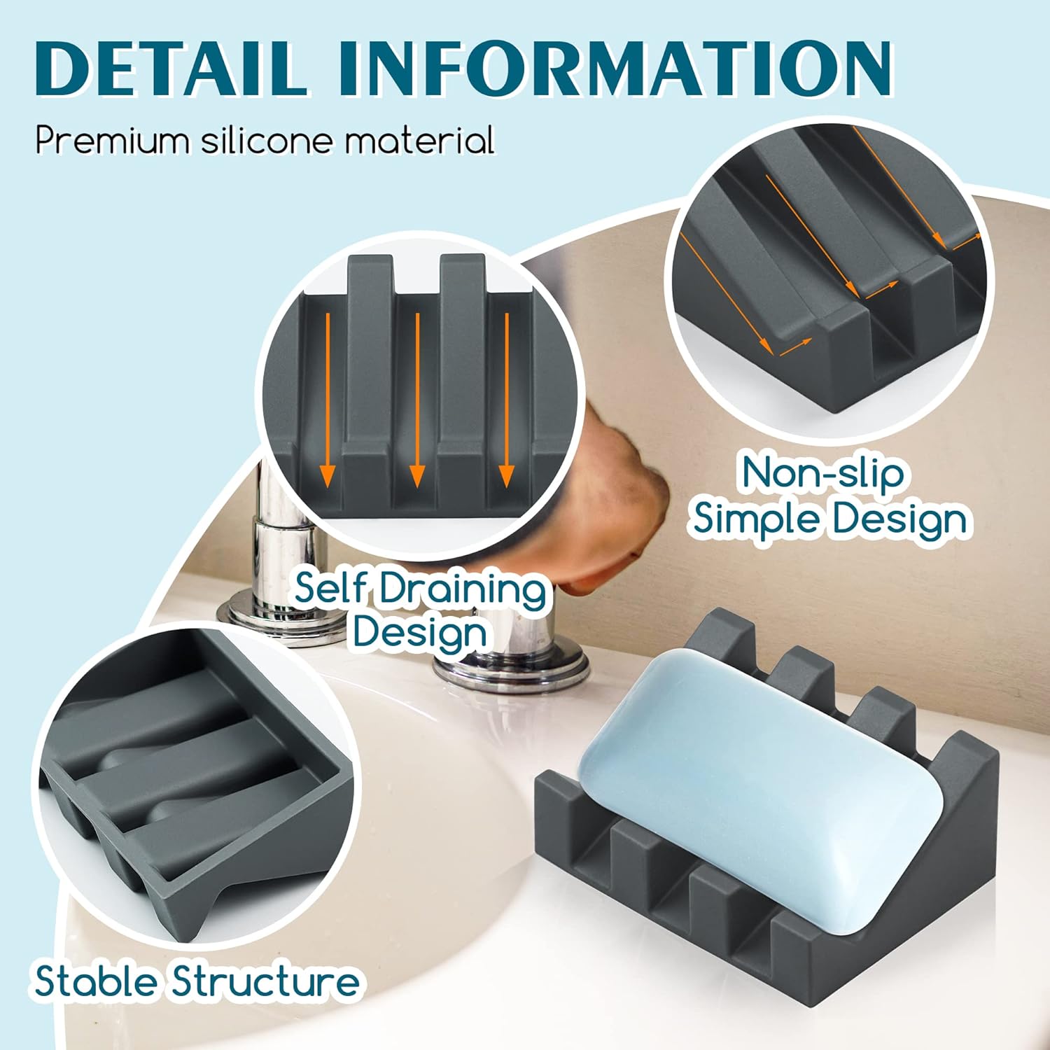Silicone Soap Dish for Bar Soap Holder for Shower Bathroom Self Draining Waterfall Drying Tray Keep Soap Bars Dry Clean & Easy Cleaning (White Gray Black, 3)