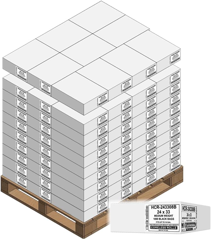 Aluf Plastics 12-16 Gallon Black Trash Bags (1000 Count) - 24" x 33" - 8 Micron Equivalent High Density Value Garbage Bags for Bathroom,Recycling(1 Pallet of 100 Cases, 100000 Bags Total)