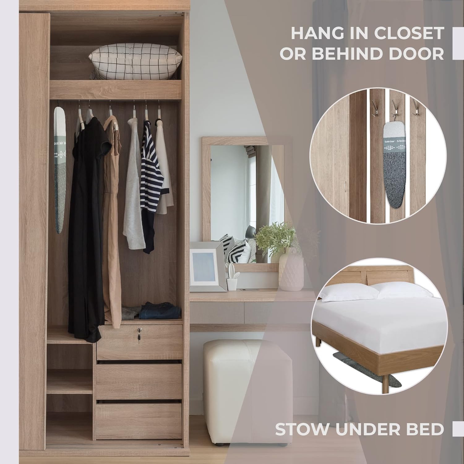 - STORAGE HANGER - LIGHTWEIGHT, Special designed hanger to hang the ironing board in closet, lightweight easy to carry and take wherever needed, it folds almost flat to save storage space, itβs the perfect size for storage in your bedroom closet, a laundry room, or a dorm