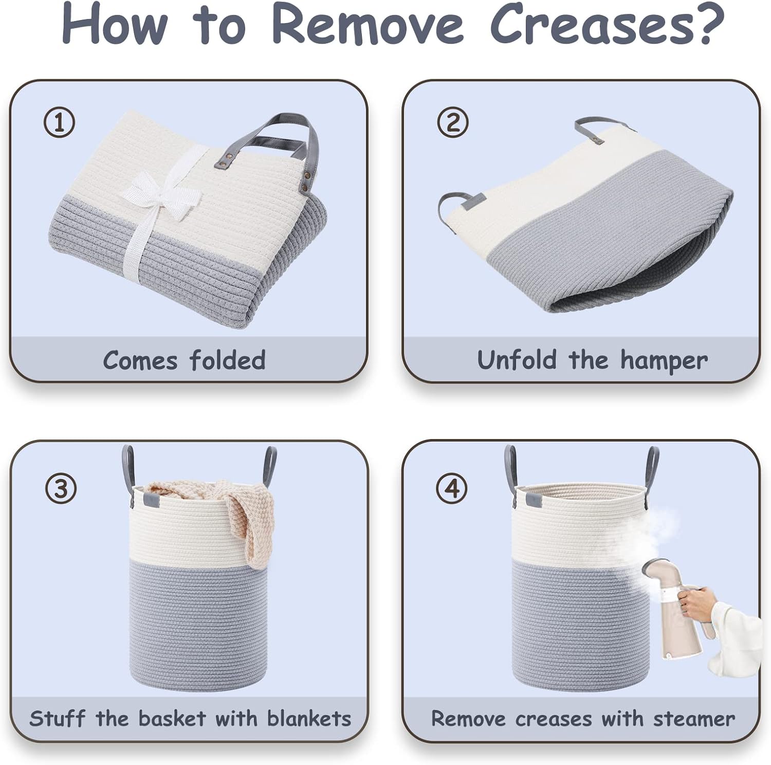 - ❤【WAY TO RESTORE ELEGANT SHAPE】 Our collapsible baskets are folded during shipping. Please fill the hamper with clothes or blankets for a period of time. If you want to remove creases from the surface of the tall basket, you can use a steamer.