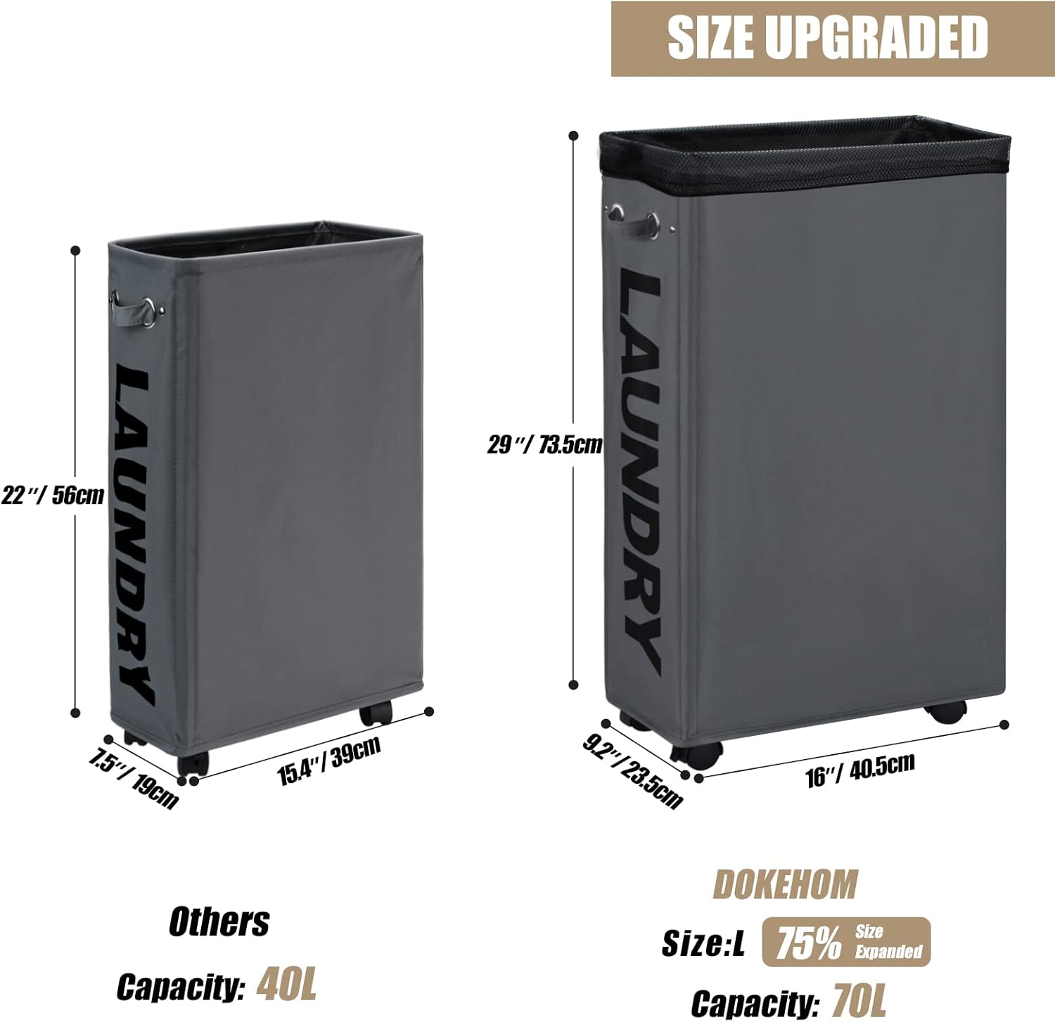 DOKEHOM 29-Inches Enlarged Slim Laundry Basket with Removable Wash Bag on Wheels, Collapsible Rolling Laundry Hamper, Foldable Narrow Corner Clothes Storage Bins (Dark Grey)