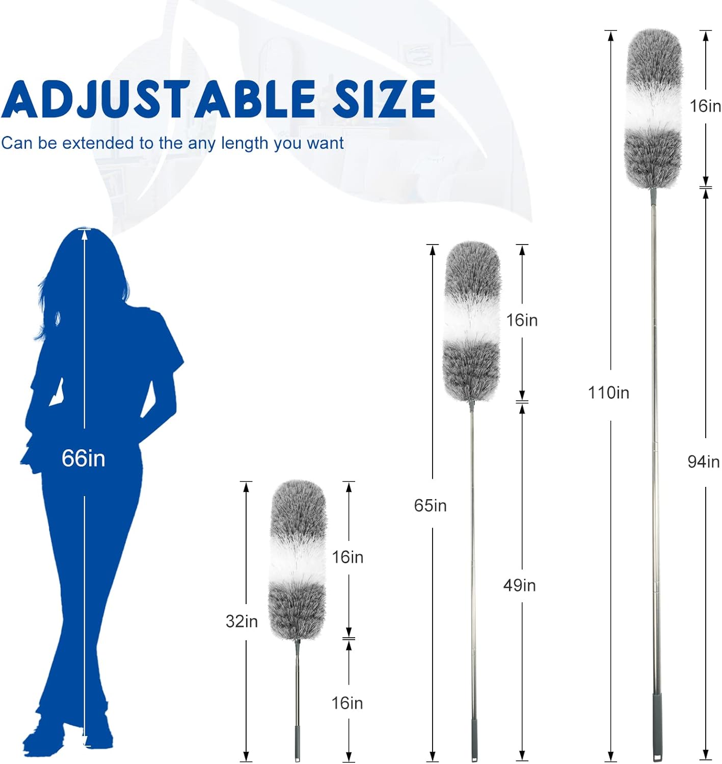 - 【DURABLE EXTENSION POLE】: Our cleaning duster's pole comes with a high quality thickened telescopic stainless steel pole. Stronger, no rust. You can extend the length of the precipitator from 30 inches to 110 inches. No need to worry about the pole breaking or spinning. Bendable dusters with extension poles can help you safely clean anywhere you need to avoid climbing ladders. Experience the joy of a clean home without the hassle of traditional cleaning tools.
