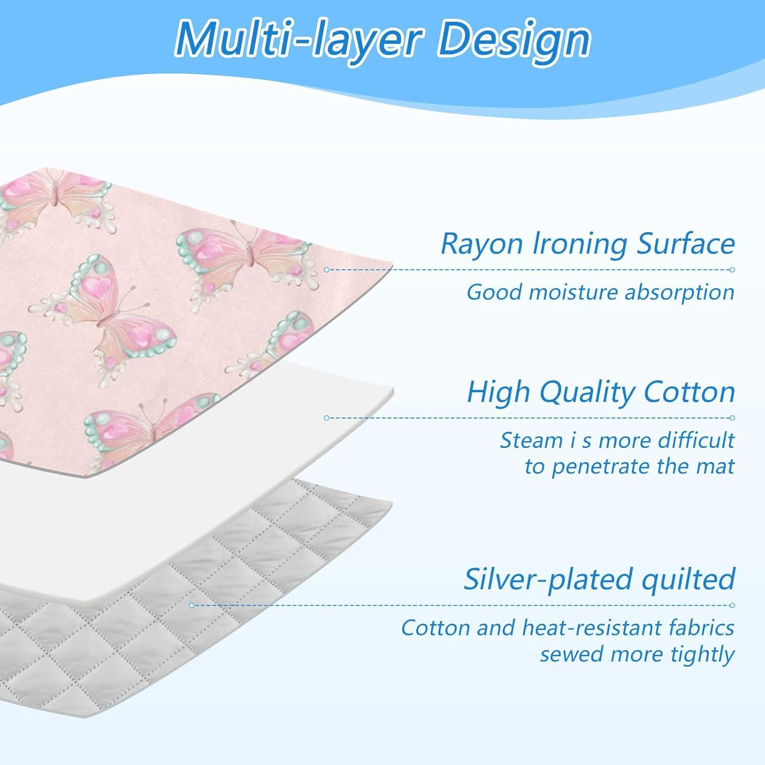 - Material: Our ironing mat for table top has 3 layers, rayon ironing surface + high quality cotton + silver-plated quilted fabric, making it durable to use