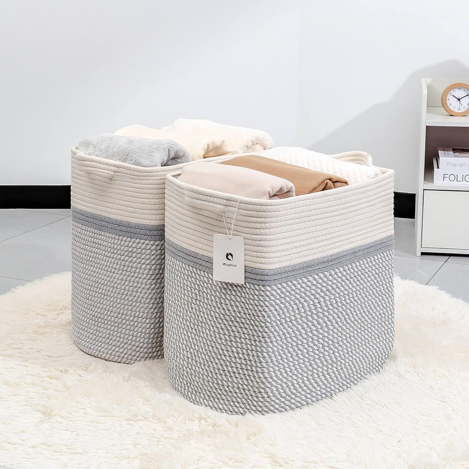 Storage Baskets for Clothes Fabric Cotton Rope Storage Basket with Handles, Decorative Woven Basket for Living Room,Closet Organizer Blankets, and 2bags (White/Gray, L16×W11.4×H15.9)
