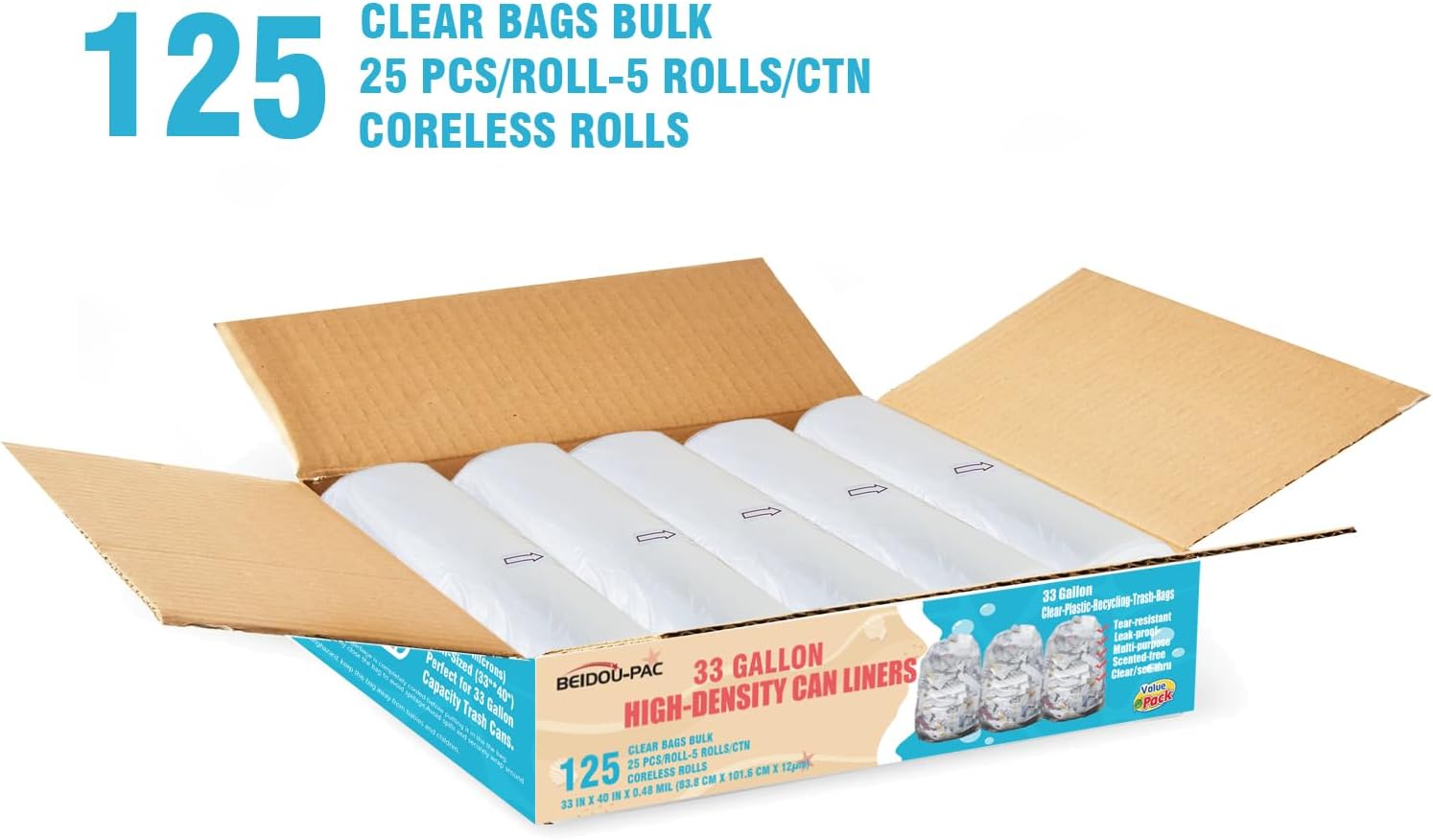 - 1, Product information: BEIDOU-PAC 33 gallon large clear plastic recycling Can Liners, Size: 33"*40"x 12 mic, Total 125 clear bags bulk (25 PCS/ROLL, 5 CORELESS ROLLS/CTN), Perfect for 33 Gal Capacity Office, commercial, industrial, or residential waste.