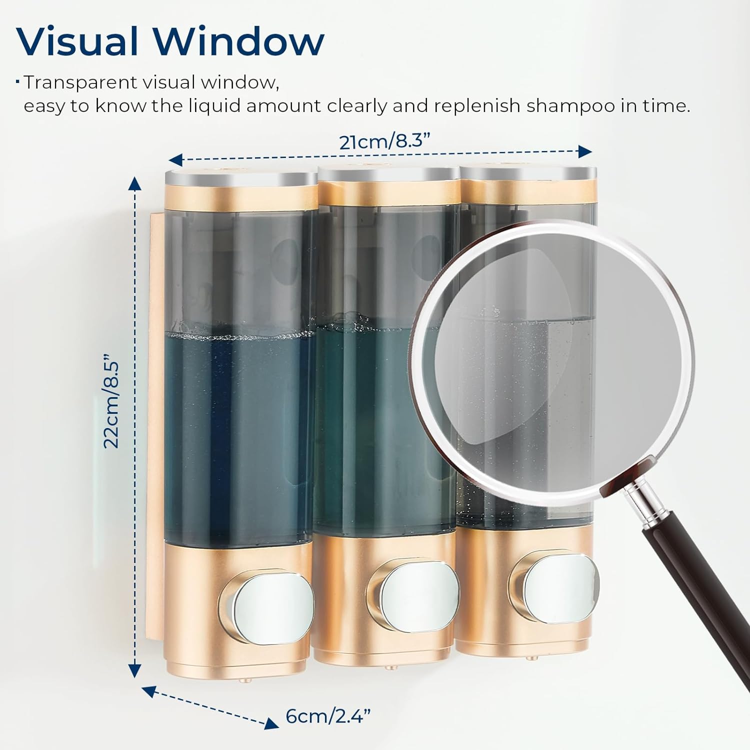 - 🪭LARGE CAPACITY-Shower soap dispenser holds 300 ML/12.85 US (each Chamber), easy to fill with soap liquid; Transparent visual window,easy to know the liquid amount clearly and replenish shampoo in time; Super large coating button and manual pump can operate with press lightly,moderate liquid once pump output, no leakage and waste.