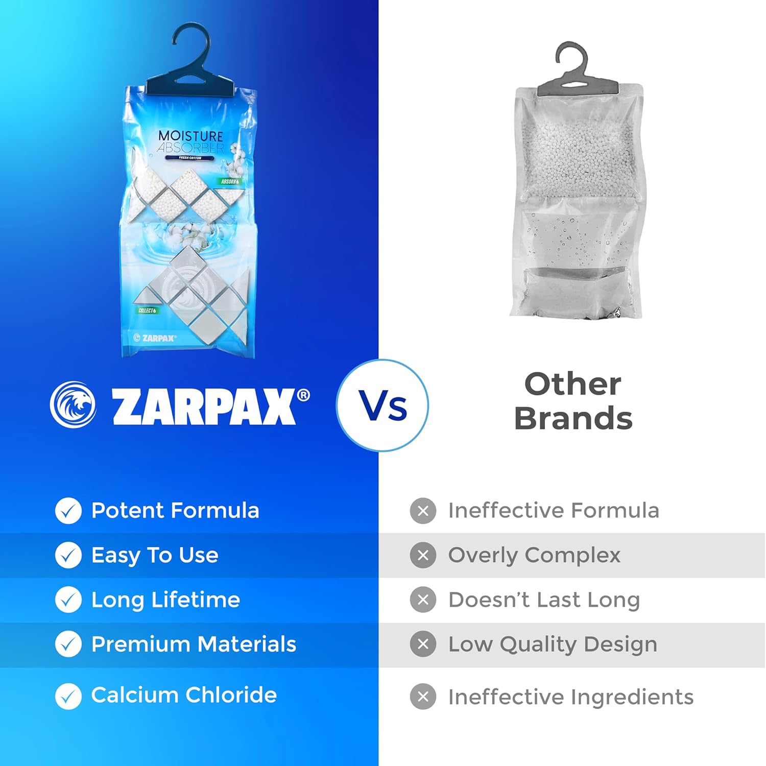 - POTENT MOISTURE ABSORPTION: Bid farewell to moisture and create a dry, comfortable indoor atmosphere with the ZARPAX hanging moisture absorber. With a fresh cotton fragrance, this easy-to-use packet provides an effective solution to protecting your home and valuables from excess moisture. Our humidity absorbers are the perfect solution for moisture-prone areas and ensure your closets, bathroom, and laundry rooms stay dry and odor-free.