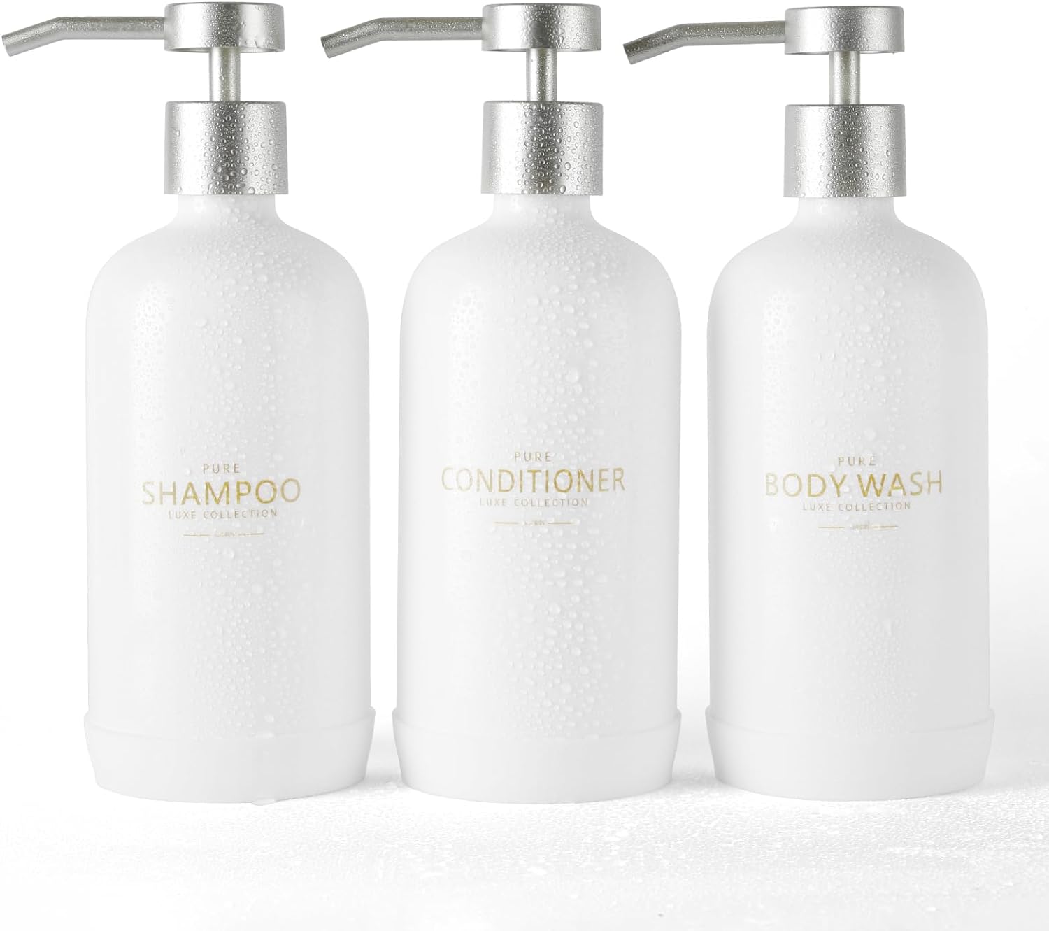 Shampoo and Conditioner Dispenser Set of 3,Refillable 21oz Shampoo Bottles with Non-Slip Protective Silicone Pad,Shower Soap Dispenser with Waterproof Labels for Bathroom (White)