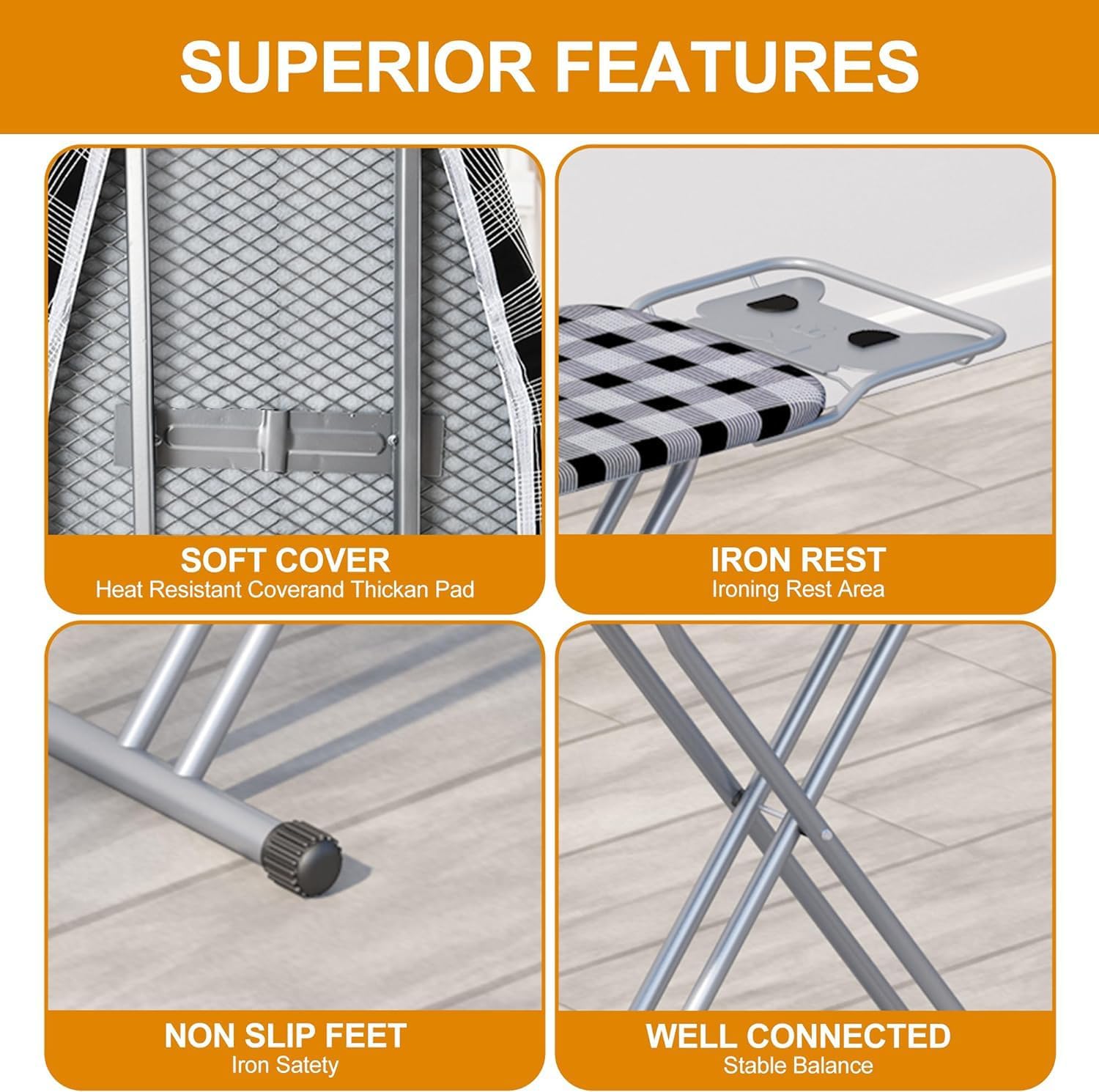 - Non-slip metal legs, locked feet design and strong long-lasting connections provide exceptional rigidity when the board is in use.The metal mesh top will allow steam to pass through and evaporate, The ironing board panel is not easy to rot like particleboard, it can breathe and dissipate heat quickly with the help of steel mesh design.