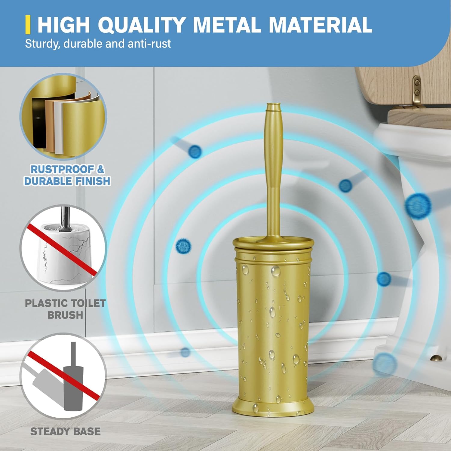 - UPGRADED ALUMINUM ALLOY MATERIAL: Aluminum alloy toilet brush upgraded from the classic plastic toilet brush. This material adds weight to the toilet brush, helps to stand firmly, and also makes your bathroom look elegant and neat.