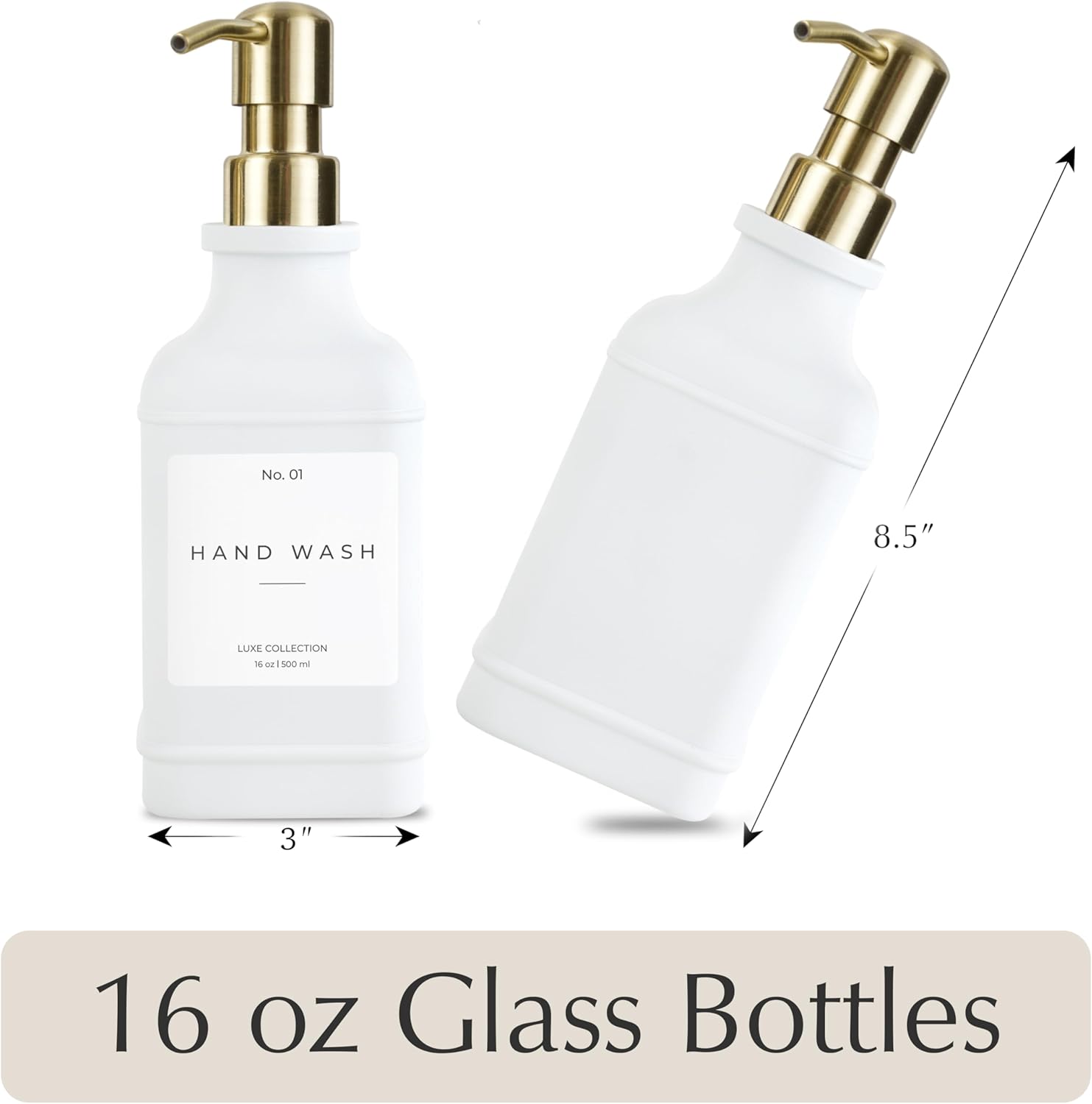 - β 2 PACK: While other dispensers peel over time, our dispensers are made of premium quality and last far longer. The bathroom soap dispensers and kitchen soap dispenser set are 16 ounces and are refillable, requiring fewer refills. Ideal for using as a bathroom soap dispenser set and the glass soap dispenser with pumps boast 2 cc stainless steel pumps.