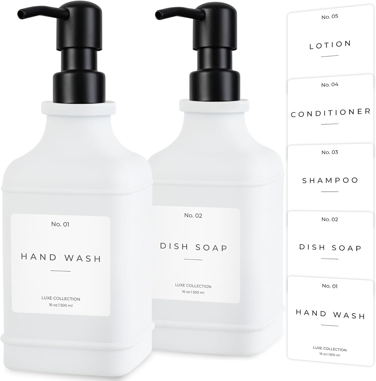 - ✅ 5 WATERPROOF LABELS: Now with 5 stickers, it's your choice to use the Kitchen Soap Dispenser Set with Dish Soap for hand soap, dish wash, lotion, conditioner, or shampoo. To clean the lotion dispenser set for the bathroom and kitchen sink soap dispenser set, just run the bottle under water and watch any residue simply wash off. With our exclusive no-leak pump, the bottle enables you to put out a good amount of soap with a single pump.