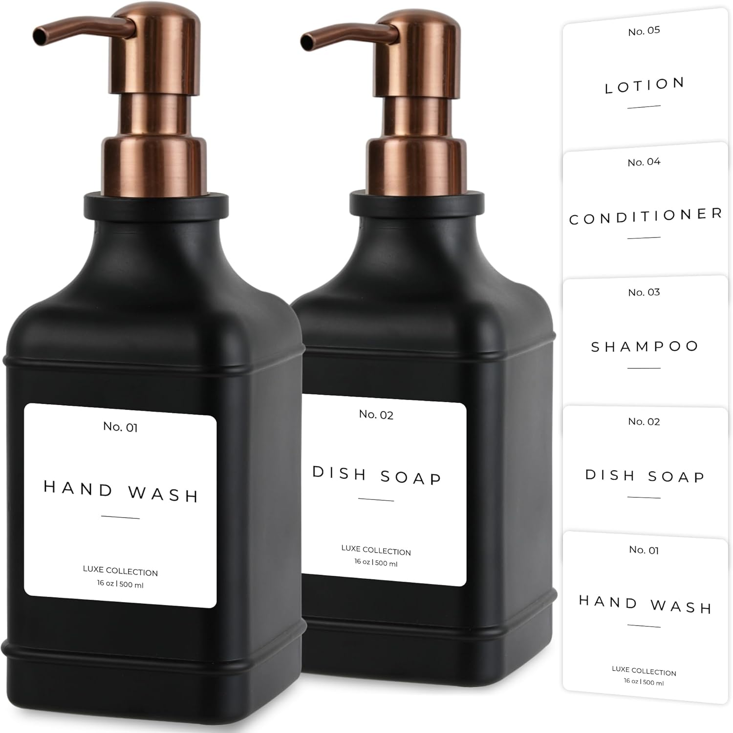 - β 5 WATERPROOF LABELS: Now with 5 stickers, it's your choice to use the Kitchen Soap Dispenser Set with Dish Soap for hand soap, dish wash, lotion, conditioner, or shampoo. To clean the lotion dispenser set for the bathroom and kitchen sink soap dispenser set, just run the bottle under water and watch any residue simply wash off. With our exclusive no-leak pump, the bottle enables you to put out a good amount of soap with a single pump.