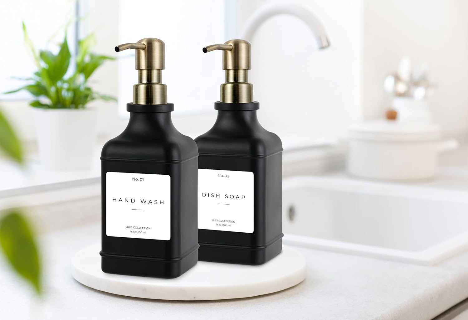 - β 5 WATERPROOF LABELS: Now with 5 stickers, it's your choice to use the Kitchen Soap Dispenser Set with Dish Soap for hand soap, dish wash, lotion, conditioner, or shampoo. To clean the lotion dispenser set for the bathroom and kitchen sink soap dispenser set, just run the bottle under water and watch any residue simply wash off. With our exclusive no-leak pump, the bottle enables you to put out a good amount of soap with a single pump.
