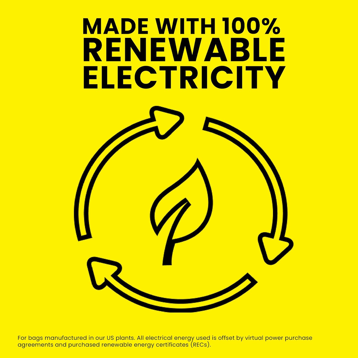- MADE WITH 100% RENEWABLE ELECTRICITY*: For bags manufactured in our US plants, all electrical energy used is offset by virtual power purchase agreements and purchased renewable energy certificates
