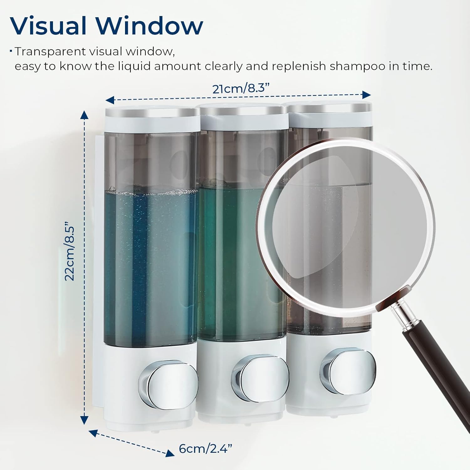 - LARGE CAPACITY-Shower soap dispenser holds 300 ML/12.85 US (each Chamber), easy to fill with soap liquid; Transparent visual window,easy to know the liquid amount clearly and replenish shampoo in time; Super large coating button and manual pump can operate with press lightly,moderate liquid once pump output, no leakage and waste.