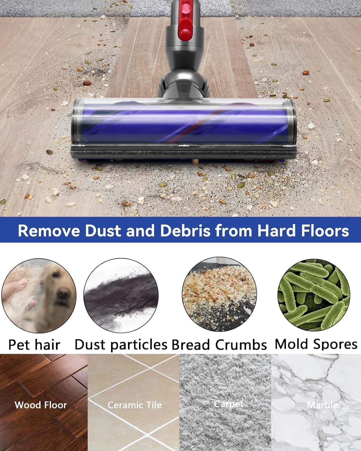 - 【Easy to Detach and Replace】The brush roller is reusable, easy to detach and install. Suitable for cleaning carpets, hard floors, tile floors, and more.The V8 roller brush effectively tackles dirt, dust, and debris on floors, corners, and sides, especially handling hair and pet hair.