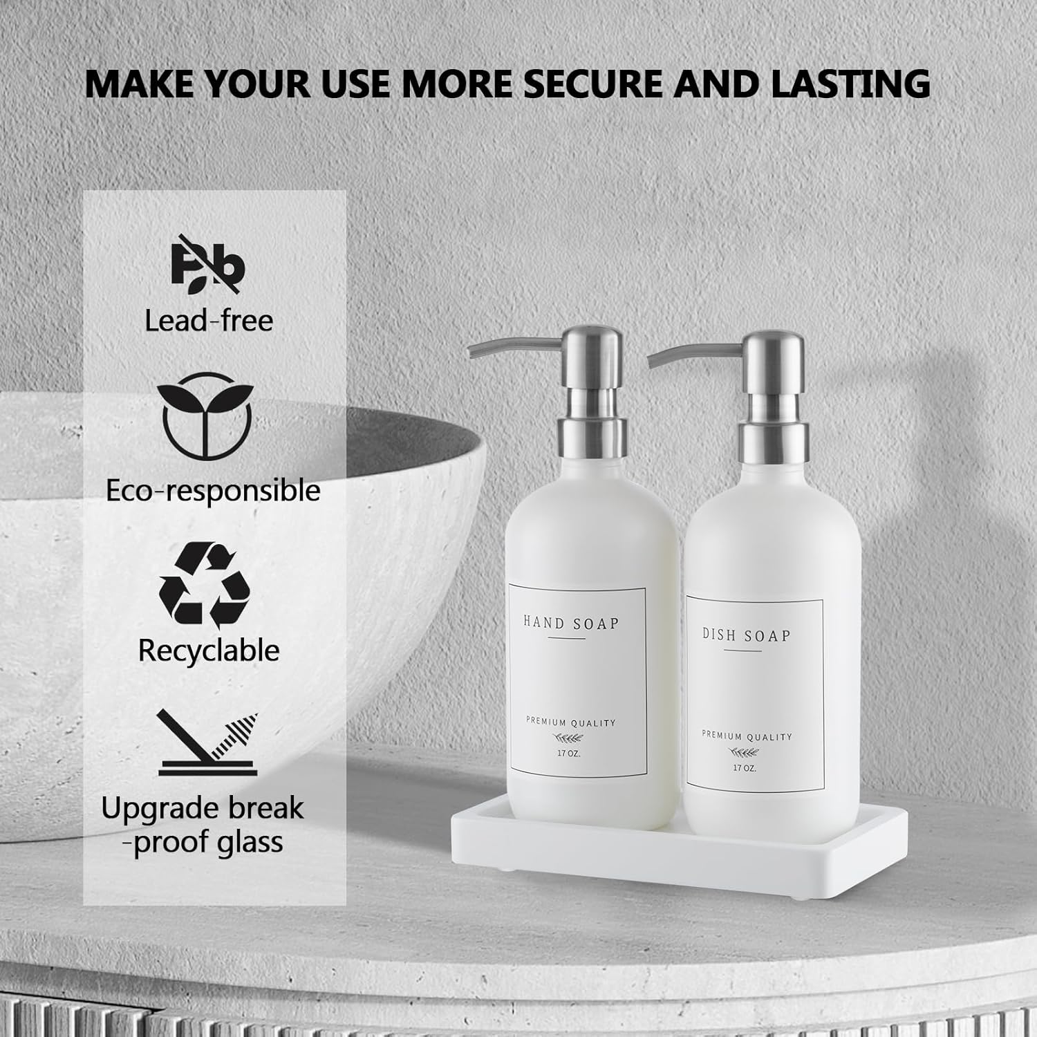 - GREAT VALUE FUNCTIONAL & AESTHETIC DISH AND HAND SOAP DISPENSER SET: 2 fortified lead-free reusable glass kitchen soap dispenser, 2 sleek silver stainless steel pump to match your sink hardware, 1 collapsible silicone funnel, 1 durable waterproof soap dispenser tray, 7 kinds of waterproof stickers and 2 color ( Hand Soap, Dish Soap, Hand Lotion, Shampoo, Conditioner, Body Wash, Sanitizer), suitable for any style of home decor.
