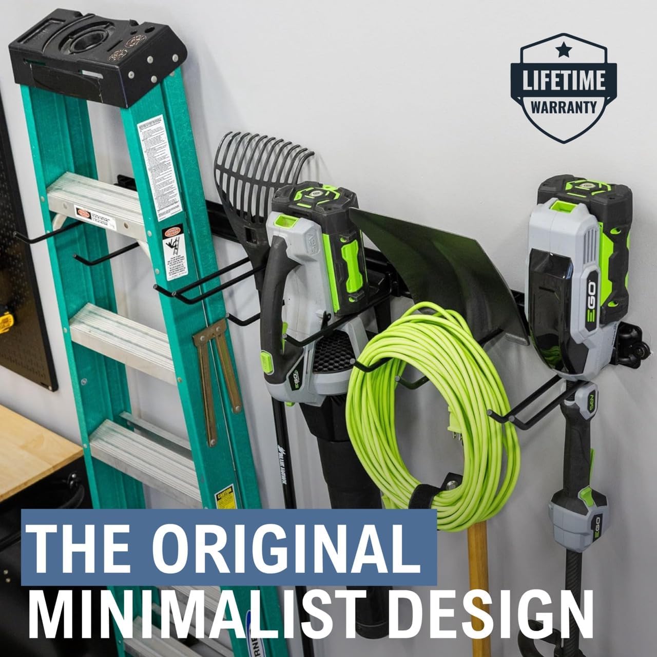 - INCLUDES 48" STORAGE RACK SYSTEM – Features modular wall hangers and wall shelves with expandable hooks that create a complete garage wall organizer. Dimensions: 48" wide with multiple tool storage organizer slots to secure yard tools, broom holder wall mount, and more.