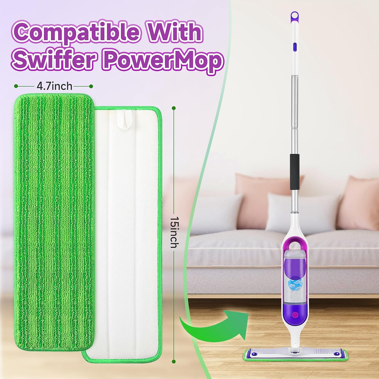 - Perfect Compatibility: Ashsajkd reusable powermop refills are compatible with Swiffer PowerMop spray mops and can be used for 13-15 inch spray mops.Tips: Please soak the power mop pads for 5-10 minutes before first use, then they can restore the thickness and stickiness
