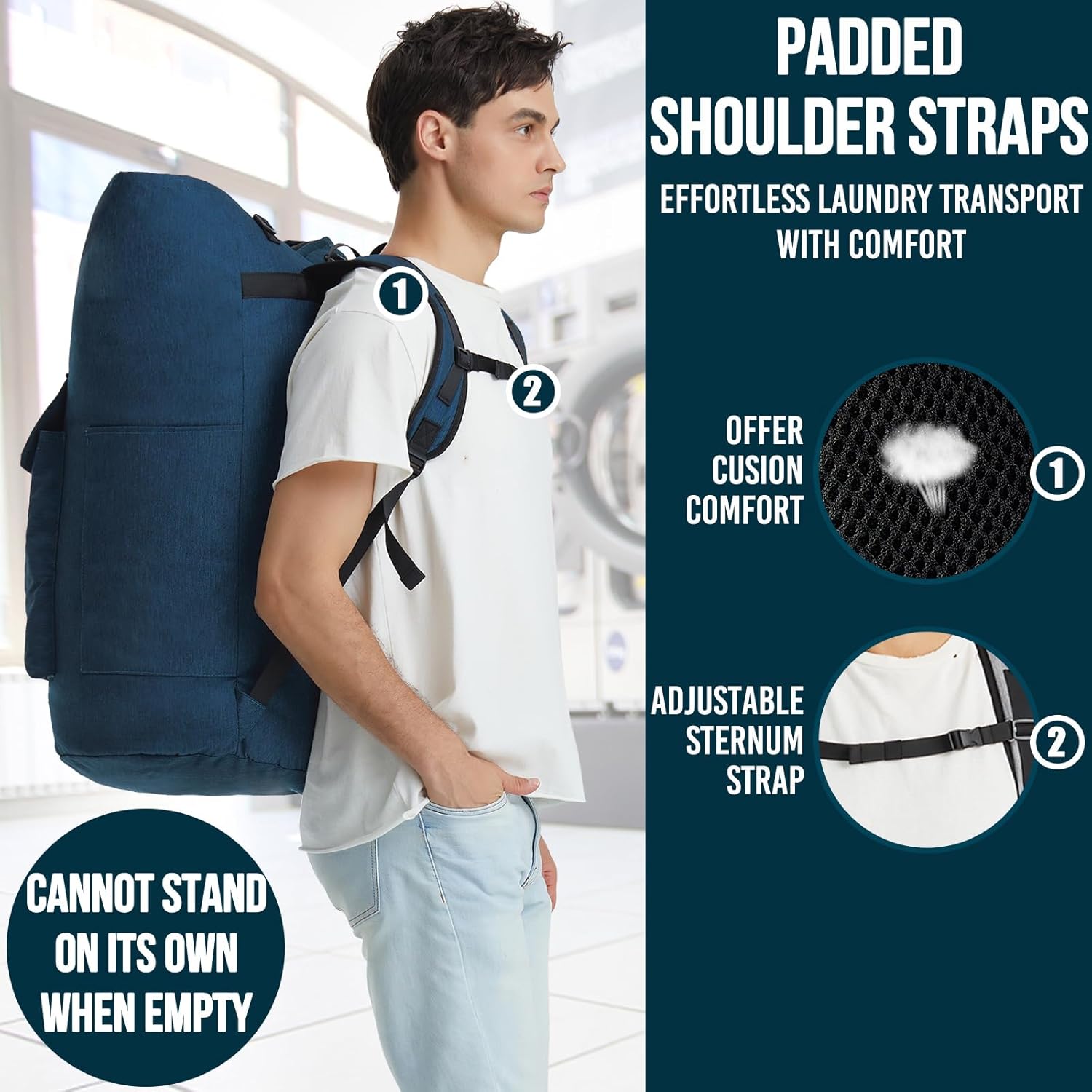 - Effortless laundry transport with comfort: Featuring thicker padded shoulder straps, along with an adjustable sternum strap, the laundry bag backpack makes carrying laundry a breeze; Whether you’re taking your laundry going up and down stairs to the basement of your building or maneuvering through busy sidewalks to the nearest laundromat, our backpack laundry bag allows you to carry the heavy load on your back; This way, you can keep your hands-free to text, open doors, or grasp stair railings