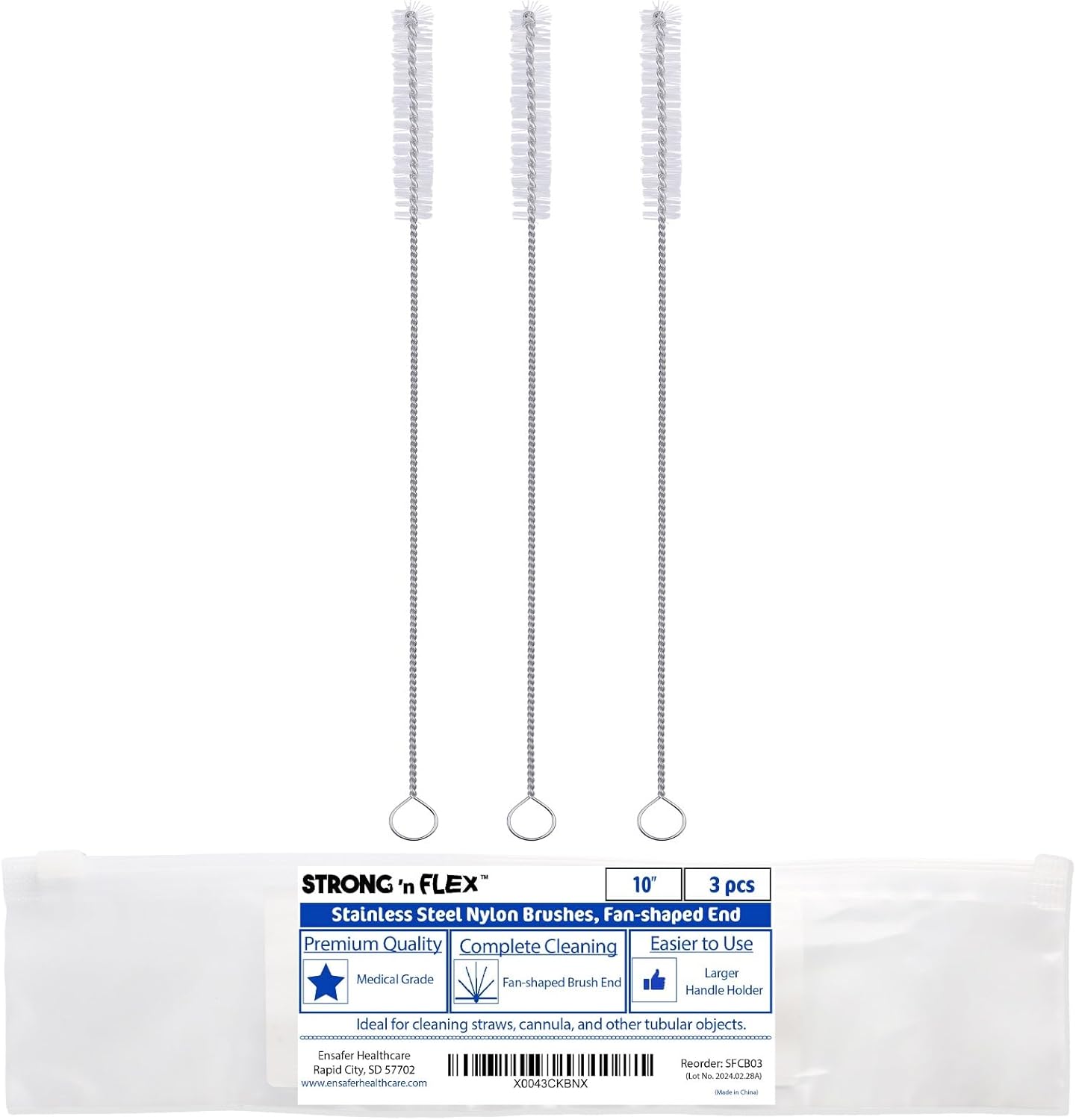 Strong 'n Flex Nylon Straw Cleaner Brushes – Fan-Shaped End for Tight Spaces, Ideal for Reusable Straws, Water Bottles, Sippy Cups & Pipes – Includes Zippered Pouch – 10" Long – Set of 3