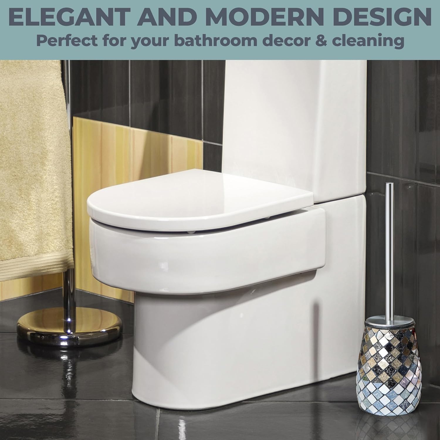 Escenzy Modern Toilet Brush and Holder Set Mosaic Glass | Non-Rustic Stainless Steel | Practical & Decorative Toilet Bowl Brush and Holder | Luxury Black and Gold Bathroom Accessories