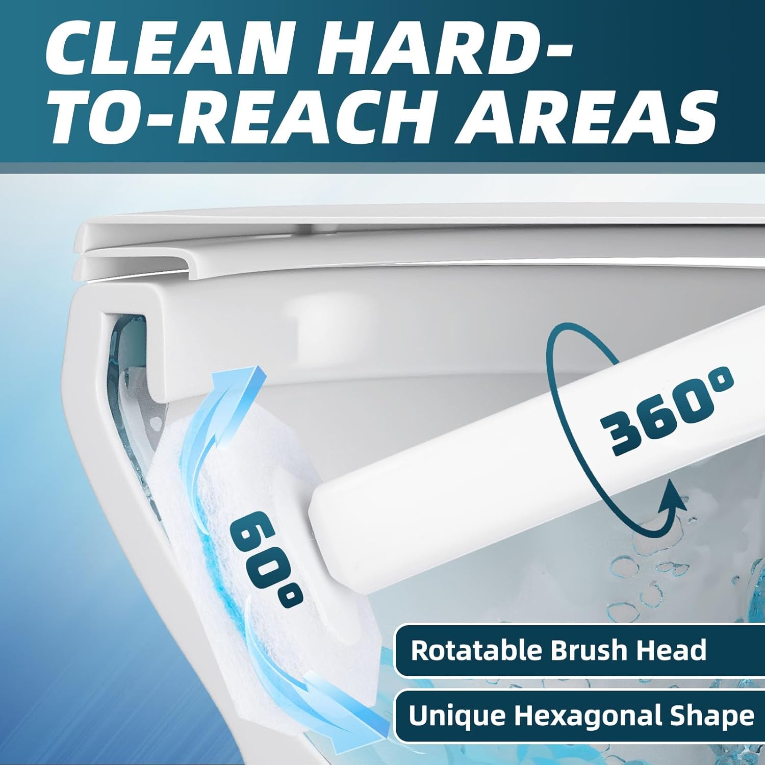 - UPGRADED BRUSH HEAD: The disposable brush head of RLOW toilet cleaning brush consists of an absorbent sponge layer, a soluble cleaning layer, and a soft cleaning cloth. In addition, its unique hexagonal shape and rotatable design allow it to effortlessly slide into every difficult to reach corner and edge of the toilet, providing deep and thorough cleaning without blind spots.