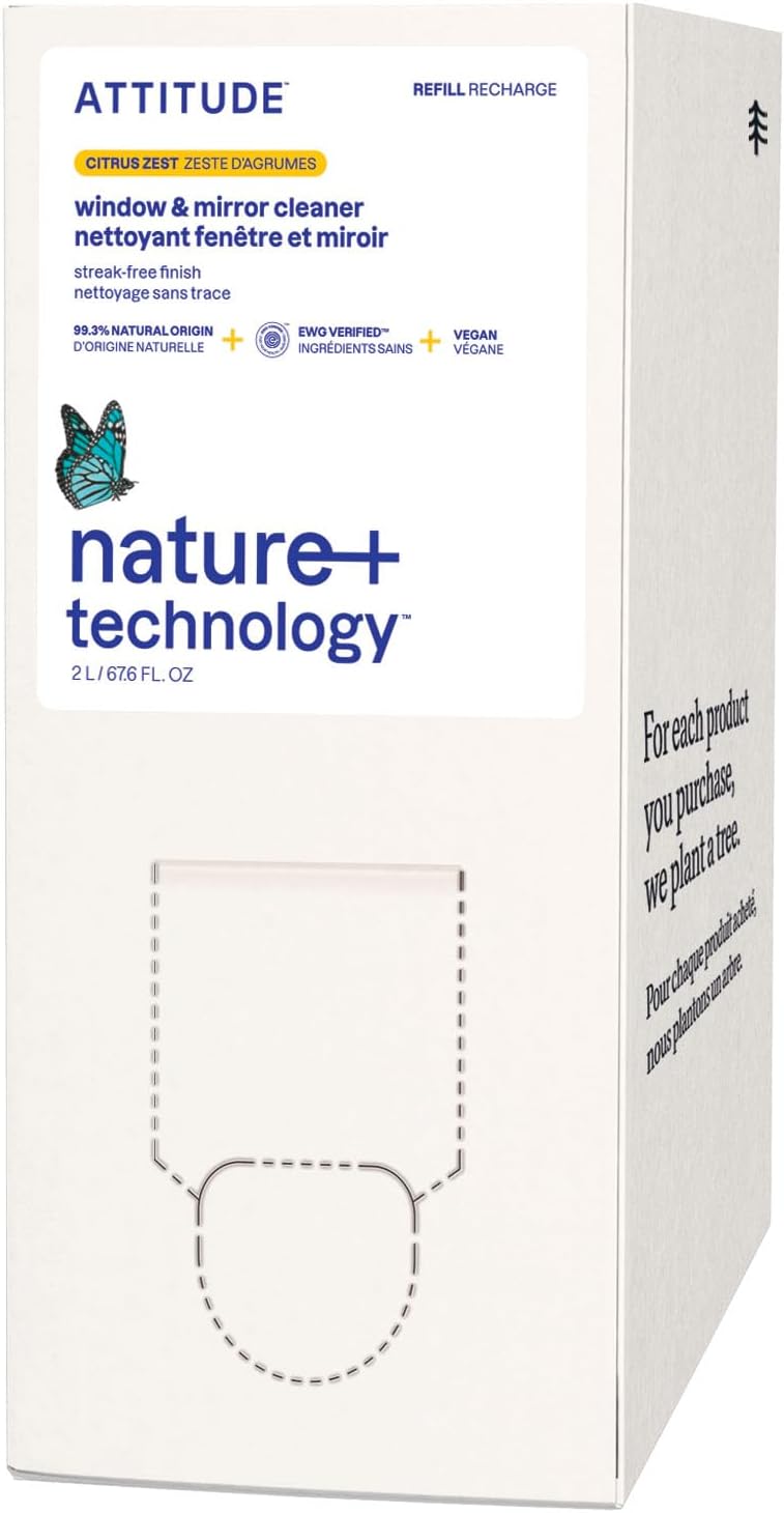 ATTITUDE Window & Mirror Cleaner Refill, EWG Verified, Plant- & Mineral-Based, Vegan & Streak-Free Glass Spray, Citrus Zest Scent, 67.6 Fl Oz