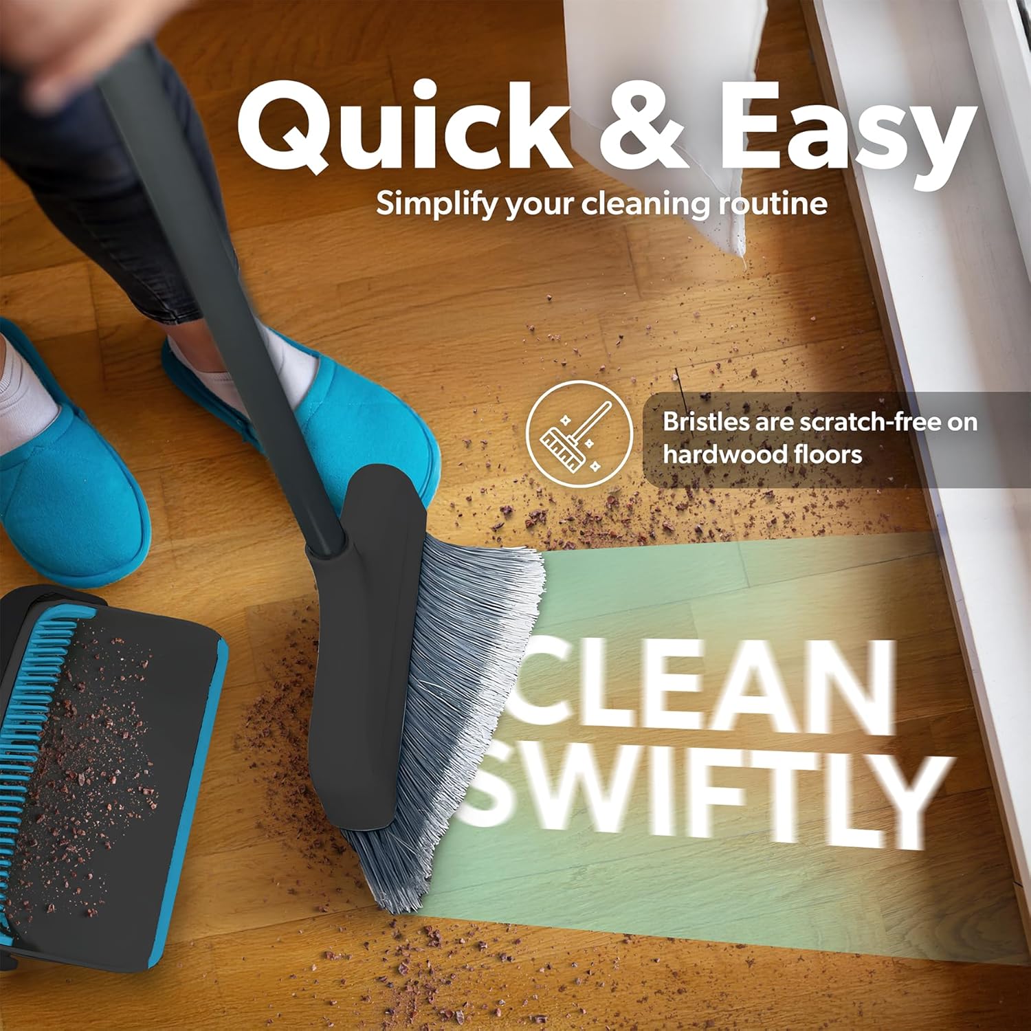 - Self Cleaning Comb Design - Sturdy teeth at the top of the dustpan comb the broom, when it collects hair/dust/lint which usually gets tangled into the bristles. Otherwise, you would need to remove them manually - not the most pleasant experience. The dustpan has a rubber lip and seamlessly sticks to the floor. It picks up everything, including the smallest particles, in the first swoop, so you will finally spend less time cleaning - more time living!