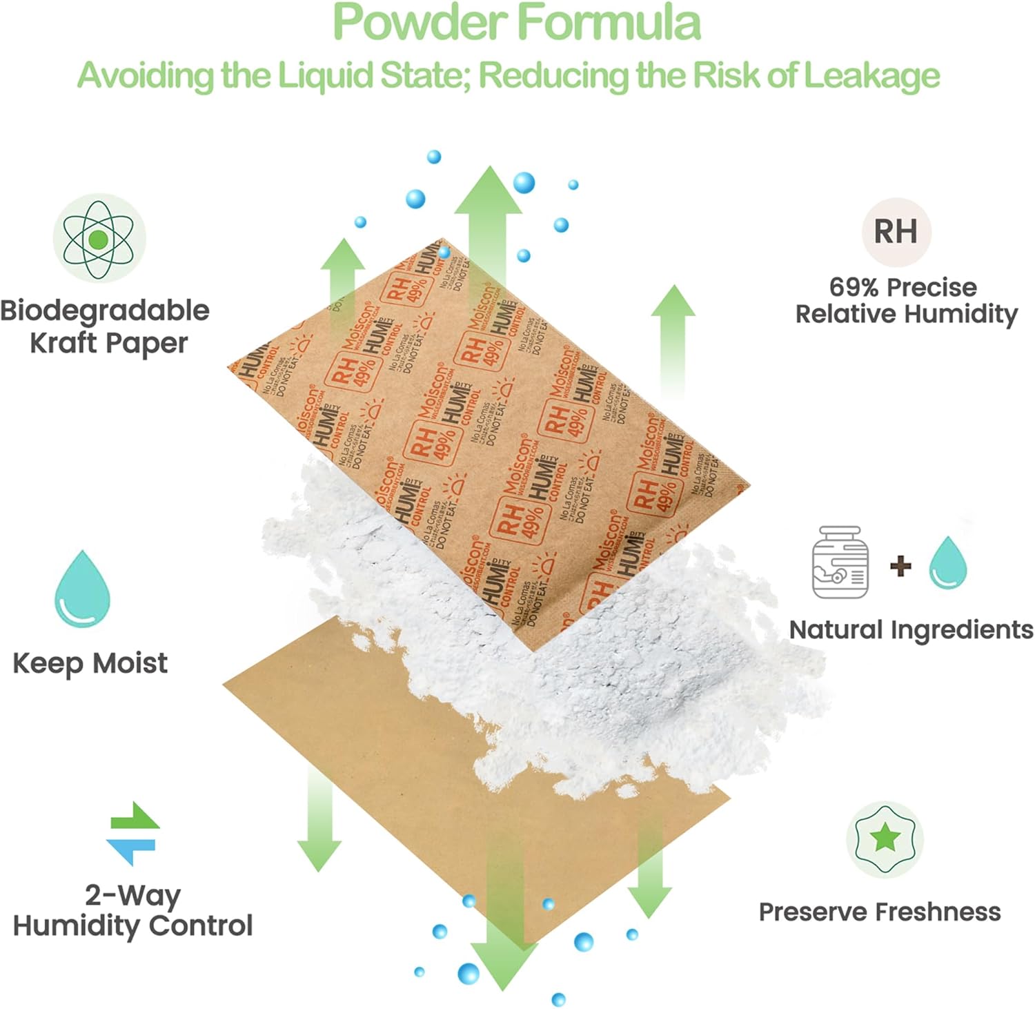 - Humidity packs consist of silica, salts, and water, but they are in powdered form. Unlike other brands of humidity control packs, Wisesorb utilizes a powder formula, ensuring that even during the process of absorbing or releasing moisture, they won't turn into a liquid state. So, please do not mistake them as "dried out" and ineffective upon receiving the product. This design reduces the risk of leakage and ensures stable performance.