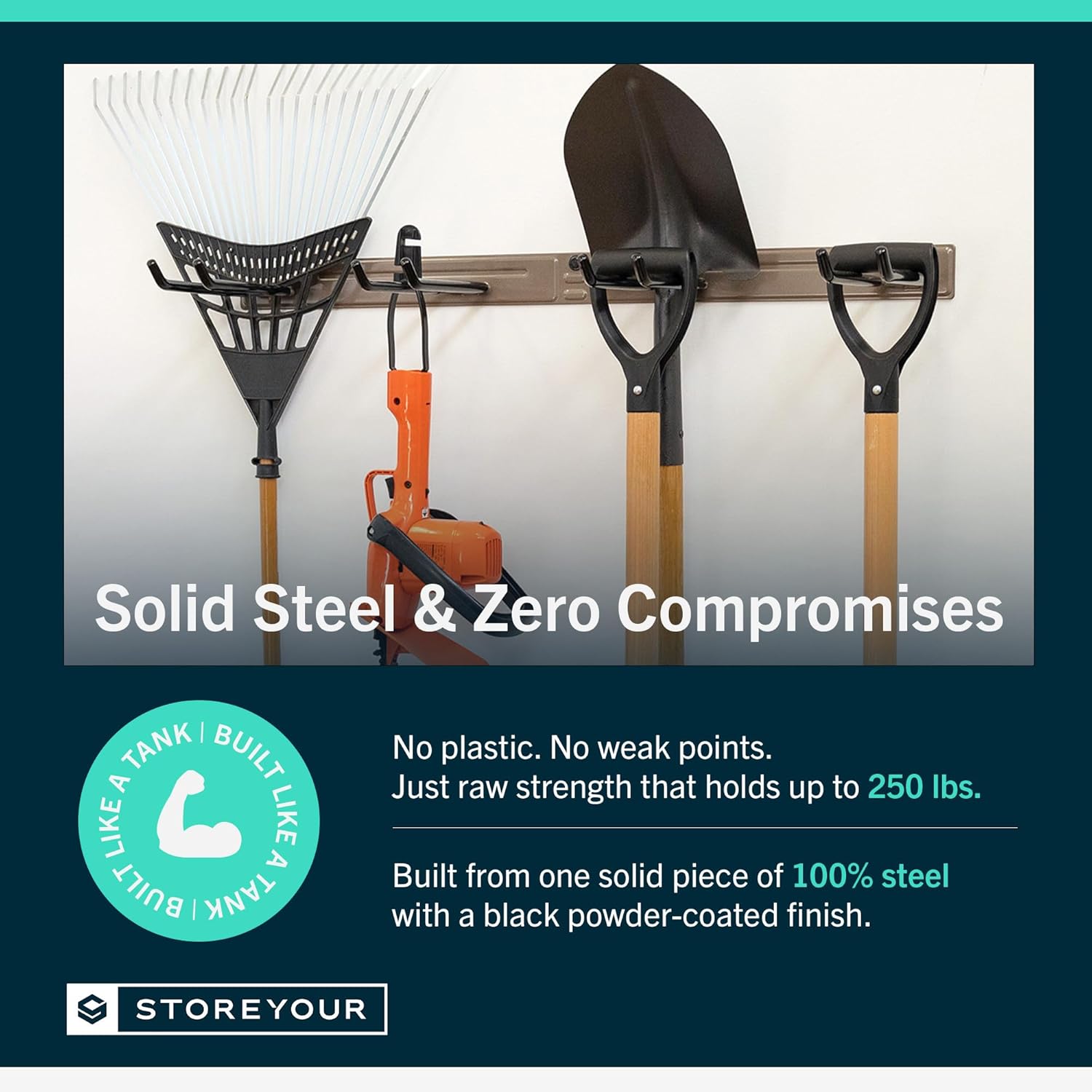 StoreYourBoard Wall-Mounted Rack With 4 Garage Hooks – Heavy-Duty Steel Holder Garage & Garden Storage for Shed, Workshop, or Home Organization – For Rakes, Shovels, Tools & More – 1 Pack, Mud