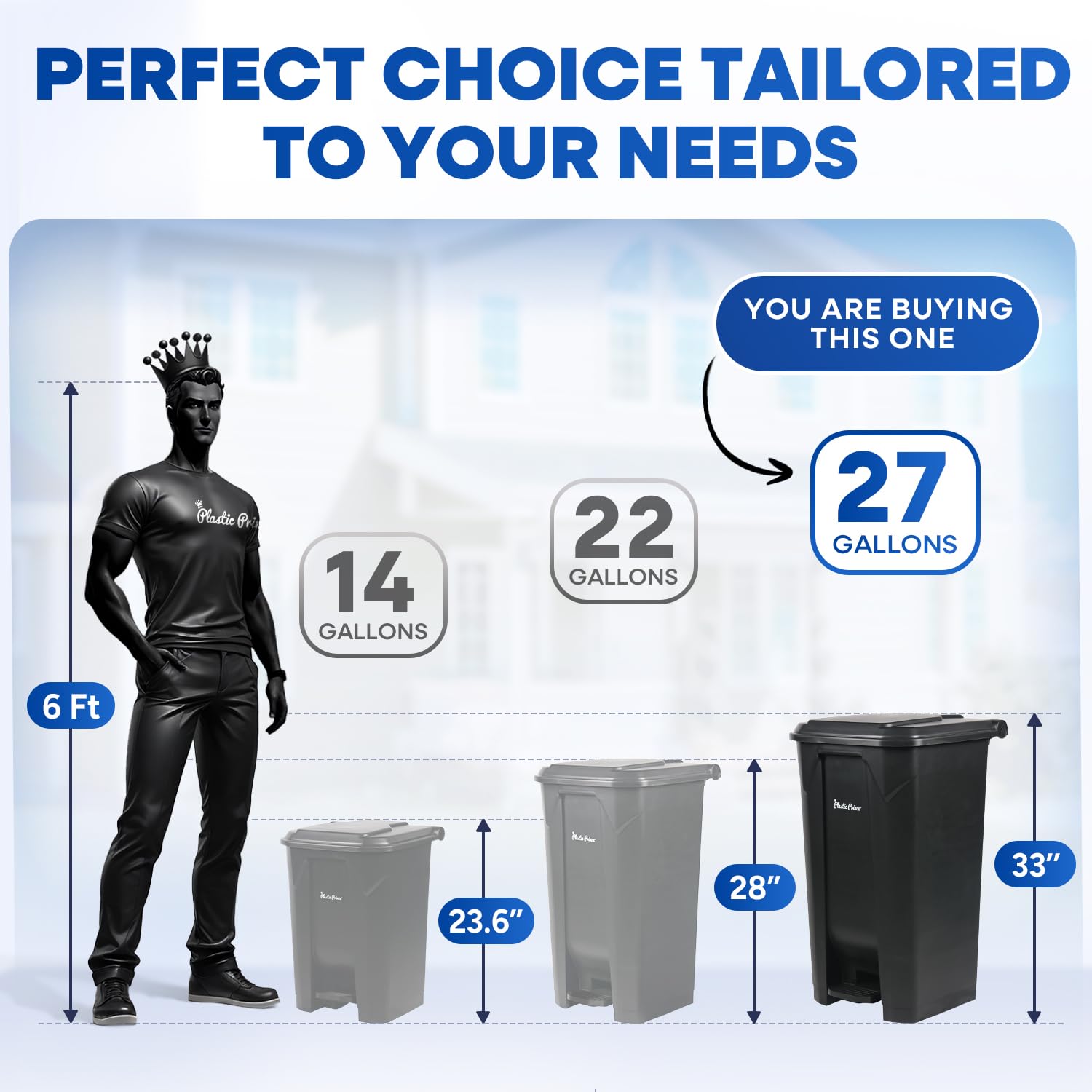 27 Gallon Step-On Trash Can/Container, Black Plastic Dustbin with Lid and Foot Pedal, Hands-Free Disposal