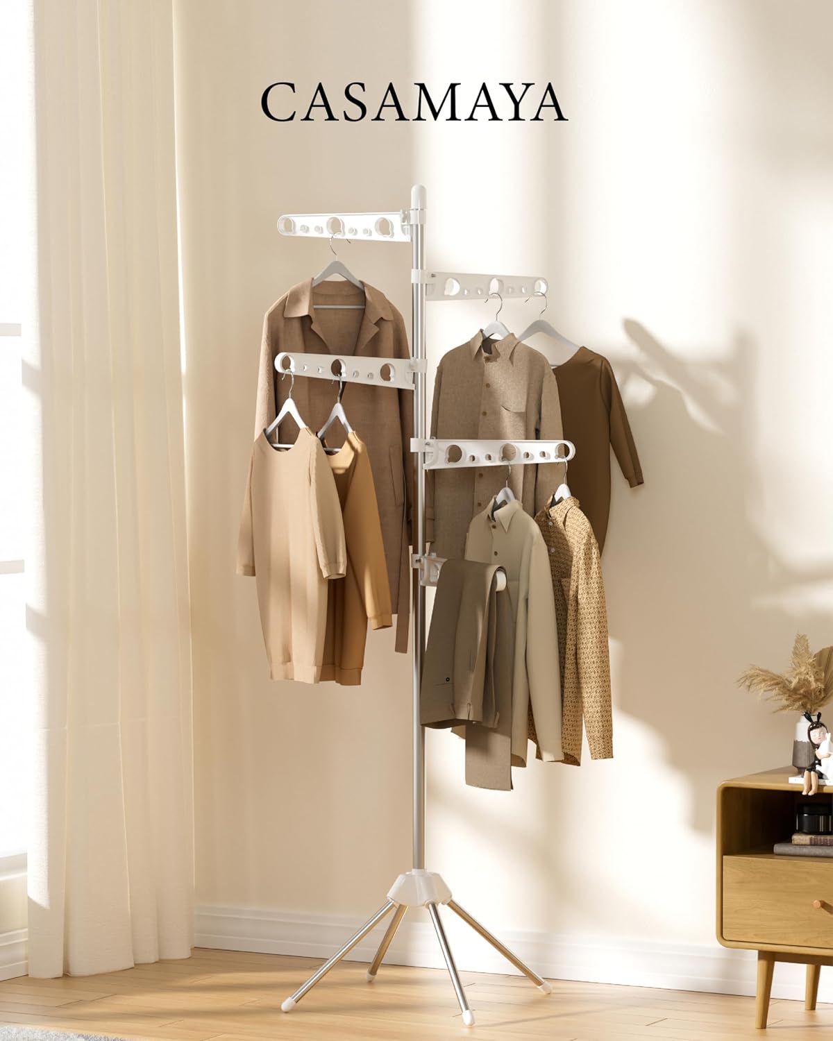 - [Height-adjustable and Rotatable Clothes Rack] The drying rack has 5 hanging rods, each of which is height-adjustable, so you can adjust it freely according to the length of your clothes. Equipped with a 360-degree swivel design, this laundry drying rack provides you with the convenience of hanging and accessing your clothes.