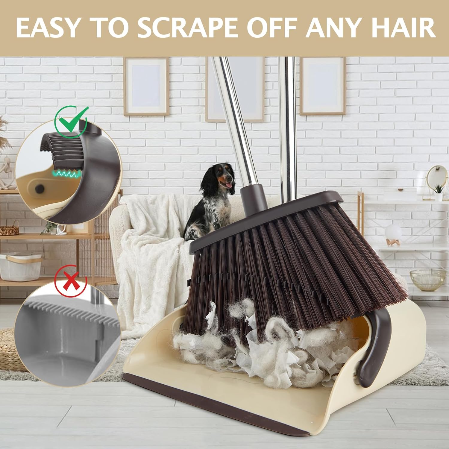 - 【Upgraded Dustpan】The newly upgraded dustpan features built-in comb teeth that make it easier to clean hair and avoid hair entanglement on the broom. The rubber lip of the dustpan is flush with the floor, soft and durable, ensuring no dust or debris is left at the bottom.