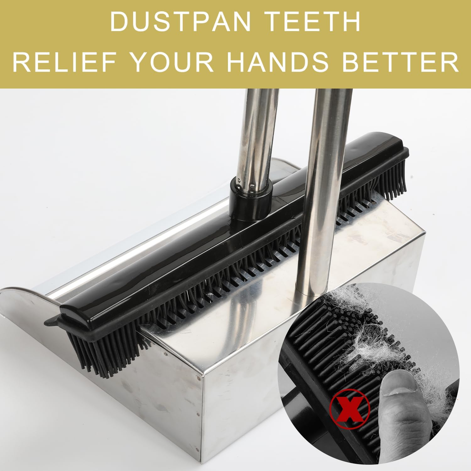 - ăDustpan with TeethăThe dustpan is made of high quality stainless steel,which is very sturdy and durable.And the teeth on the top of the dustpan can collect hair/dust/lint, which usually wraps around the bristles.The dustpan also has a rubber lip and seamlessly sticks to the floor,you clean all trash and debris into the dustpan as you sweep.