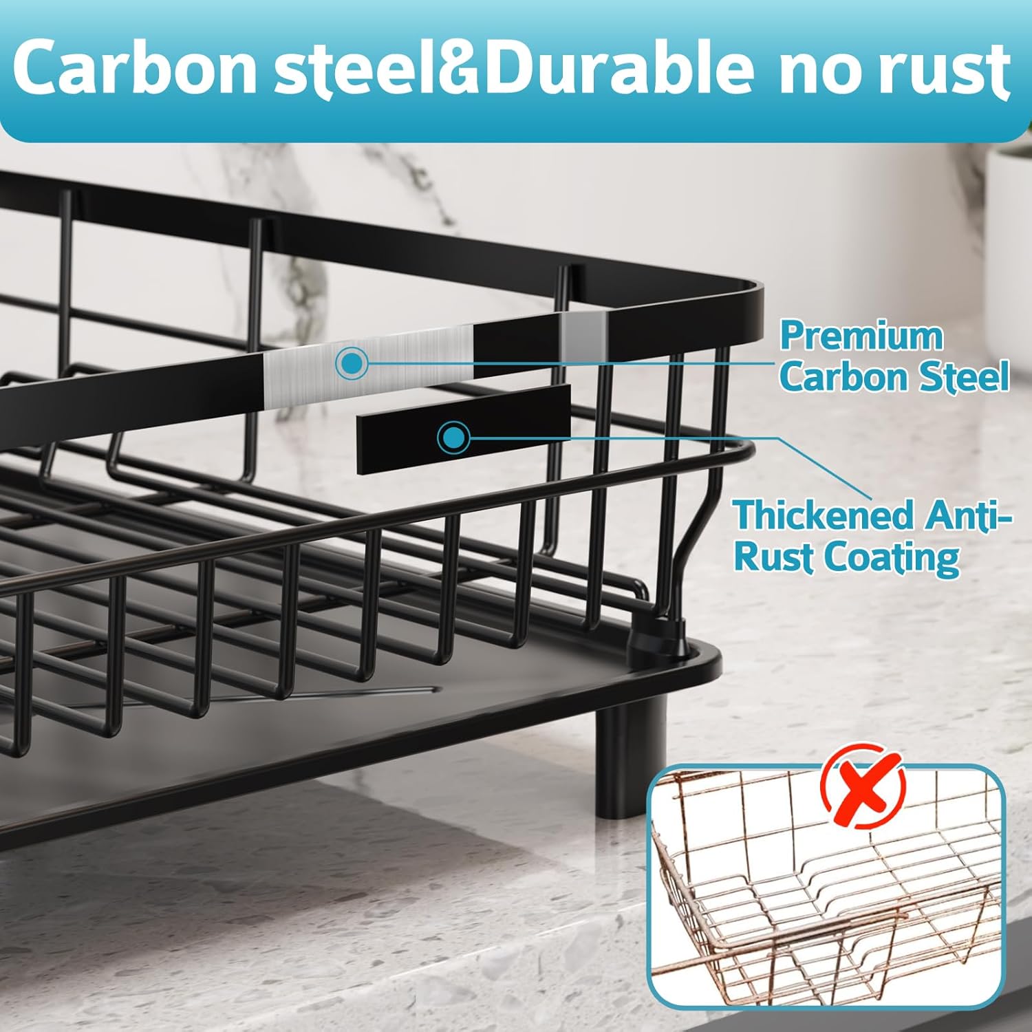 - ăSturdy & DurableăThis dish rack for kitchen counter is made of high-quality carbon steel and coated with an anti rust coating to protect the rack from rust. It is durable and easy to clean. This drying rack kitchen has passed a 24-hour salt spray test, making it a trusted metal drying rack choice for every family, providing better protection for your kitchenware
